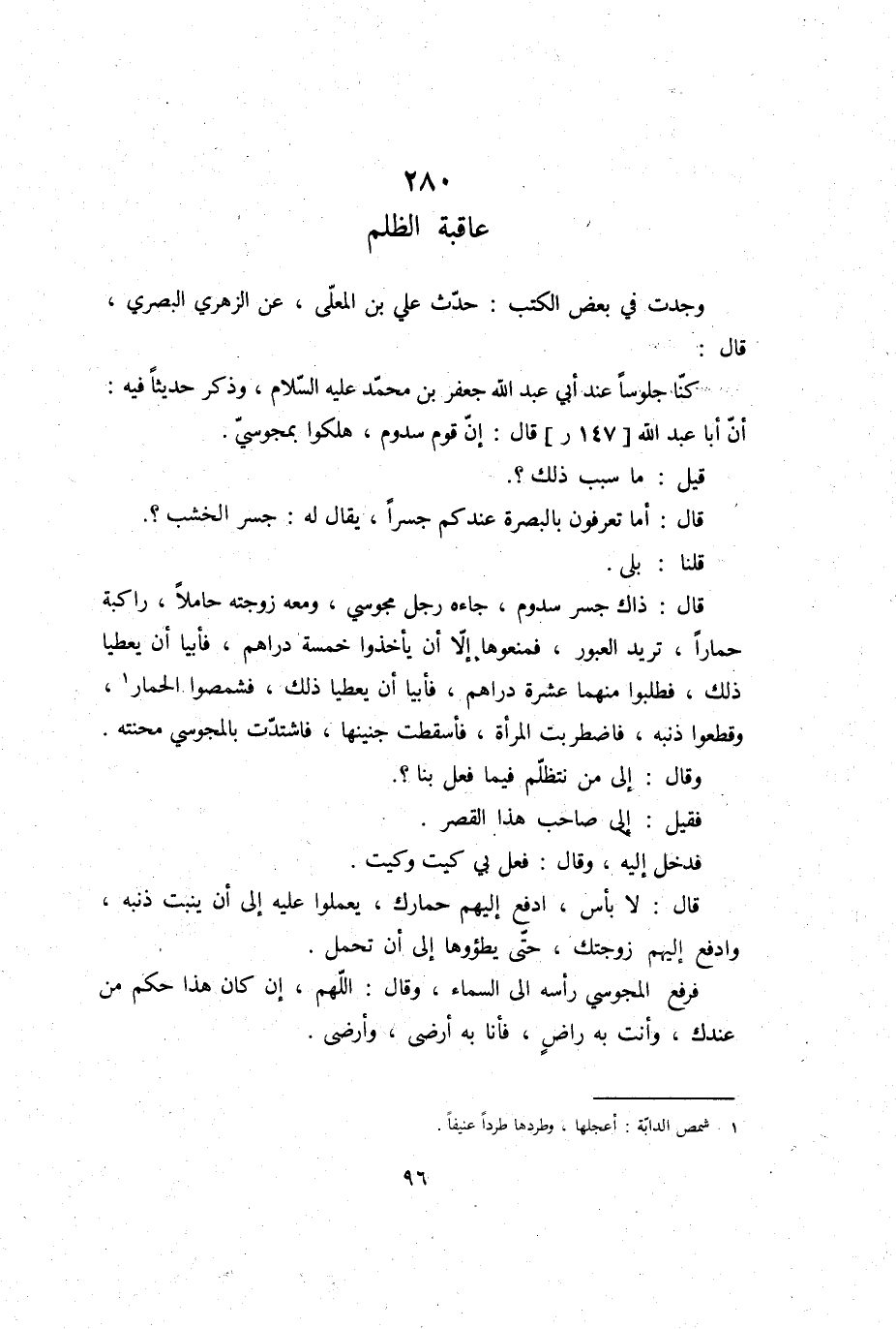 قَالَ: ذَاك جسر سدوم، جَاءَهُ رجل مَجُوسِيّ، وَمَعَهُ زَوجته حَامِلا، راكبة حمارا، تُرِيدُ العبور، فمنعوها إِلَّا أَن يَأْخُذُوا خَمْسَة دَرَاهِم، فأبيا أَن يعطيا ذَلِك، فطلبوا مِنْهُمَا عشرَة دَرَاهِم، فأبيا أَن يعطيا ذَلِك فشمصوا الْحمار، وَقَطعُوا ذَنبه، فاضطربت الْمَرْأَة، فَأسْقطت جَنِينهَا، فاشتدت بالمجوسي محنته.