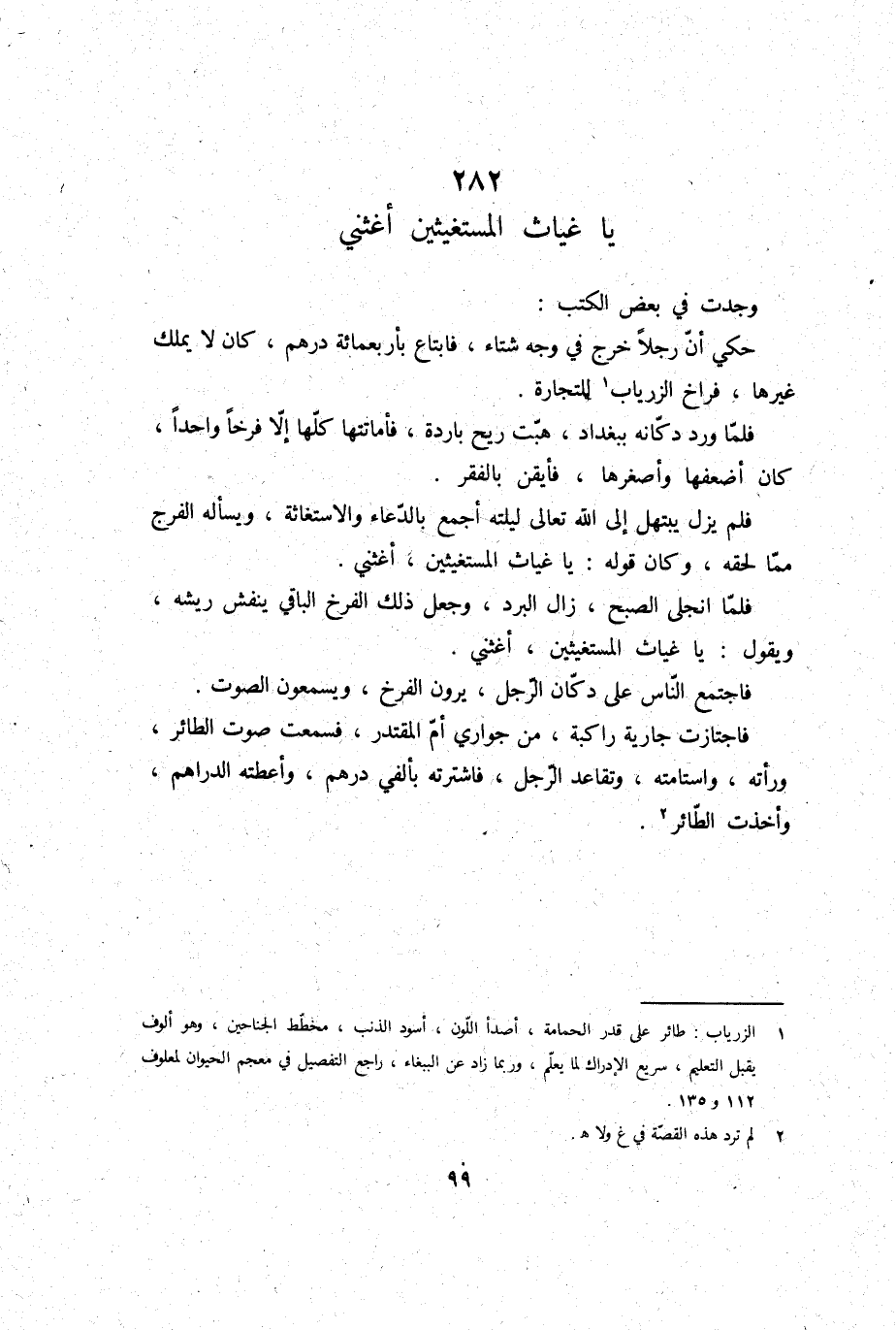 وجدت فِي بعض الْكتب: حُكيَ أَن رجلا خرج فِي وَجه شتاء، فَابْتَاعَ بِأَرْبَع مائَة دِرْهَم، كَانَ لَا يملك غَيرهَا، فراخ الزرياب للتِّجَارَة.