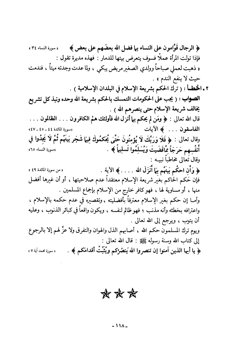 قال الله تعالى: {وَمَنْ لَمْ يَحْكُمْ بِمَا أَنْزَلَ اللَّهُ فَأُولَئِكَ هُمُ الْكَافِرُونَ. . . الظَّالِمُونَ. . . الْفَاسِقُونَ. . .} الآيات "سورة المائدة 44 - 45 - 47"