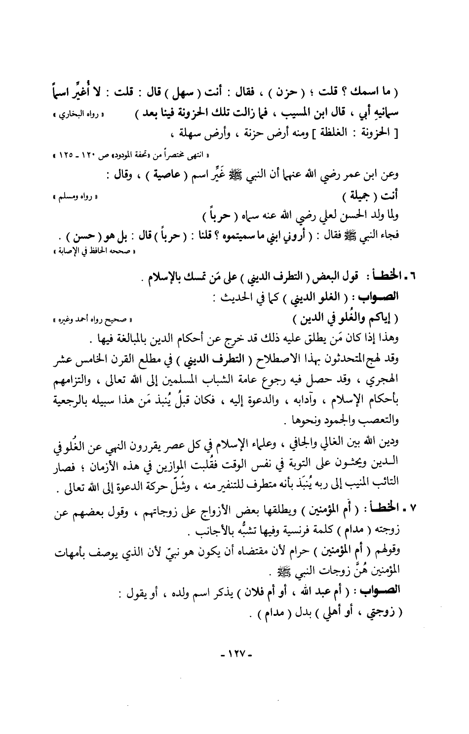 7 - الخطأ: (أم المؤمنين) ويطلقها بعض الأزواج على زوجاتهم، وقول بعضهم عن زوجته (مدام) كلمة فرنسية وفيها تشبُّه بالأجانب.
