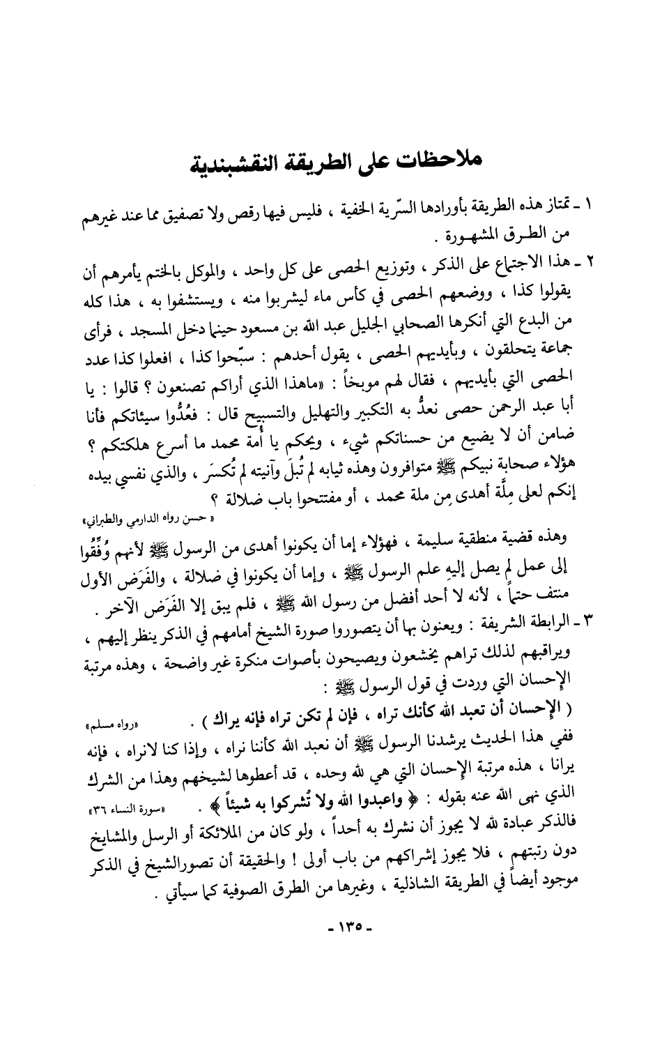 ففي هذا الحديث يرشدنا الرسول - صلى الله عليه وسلم - أن نعبد الله كأننا نراه، وإذا كنا لا نراه، فإنه يرانا، هذه مرتبة الإِحسان التي هي لله وحده، قد أعطوها لشيخهم وهذا من الشرك الذي نهى الله عنه بقوله: {وَاعْبُدُوا اللَّهَ وَلَا تُشْرِكُوا بِهِ شَيْئًا}. [النساء: 36]