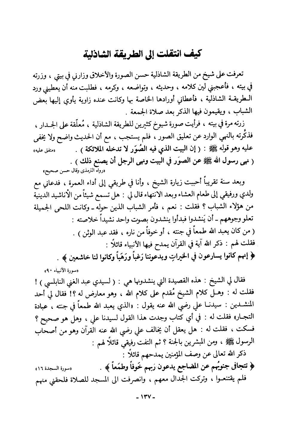 فقال لي الشيخ: هذه القصيدة التي ينشدونها هي: (لسيدي عبد الغني النابلسي) فقلت له: وهل كلام الشيخ مُقدم على كلام الله، وهو معارض له؟! فقال لي أحد المنشدين: سيدنا علي -رضي الله عنه- يقول: "الذي يعبد الله طمعًا في جنته، عبادة التجار" فقلت له: في أي كتاب وجدت هذا القول لسيدنا علي، وهل هو صحيح؟ فسكت، فقلت له: هل يعقل أن يخالف علي -رضي الله عنه- القرآن وهو من أصحاب الرسول - صلى الله عليه وسلم -، ومن المبشرين بالجنة؟ ثم التفت رفيقي قائلًا لهم:
