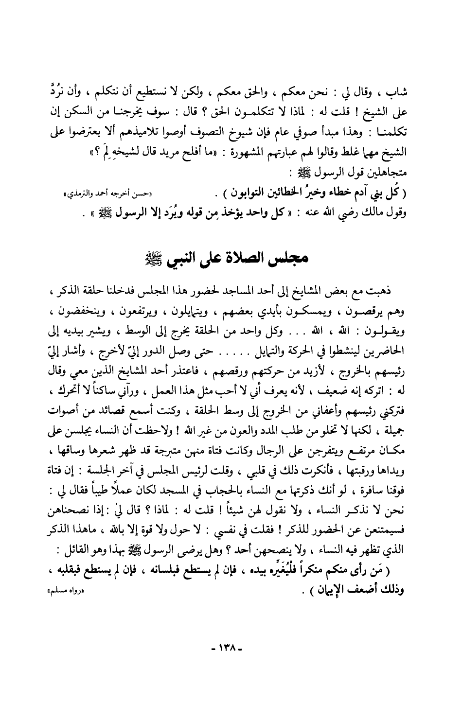 ذهبت مع بعض المشايخ إلى أحد المساجد لحضور هذا المجلس فدخلنا حلقة الذكر، وهم يرقصون، ويمسكون بأيدي بعضهم، ويتمايلون، ويرتفعون، وينخفضون، ويقولون: الله، الله. . . وكل واحد من الحلقة يخرج إلى الوسط، ويشير بيديه إلى الحاضرين لينشطوا في الحركة والتمايل. . . . . حتى وصل الدور إليّ لأخرج، وأشار إليّ رئيسهم بالخروج، لأزيد من حركتهم ورقصهم، فاعتذر أحد المشايخ الذين معي وقال له: اتركه إنه ضعيف؛ لأنه يعرف أني لا أحب مثل هذا العمل، ورآني ساكنًا لا أتحرك، فتركني رئيسهم وأعفاني من الخروج إلى وسط الحلقة، وكنت أسمع قصائد من أصوات جميلة، لكنها لا تخلو من طلب المدد والعون من غير الله! ولاحظت أن النساء يجلسن على مكان مرتفع ويتفرجن على الرجال وكانت فتاة منهن متبرجة قد ظهر شعرها وساقها، ويداها ورقبتها، فأنكرت ذلك في قلبي، وقلت لرئيس المجلس في آخر الجلسة: إن فتاة فوقنا سافرة، لو أنك ذكرتها مع النساء بالحجاب في المسجد لكان عملاً طيبًا فقال لي: نحن لا نذكر النساء، ولا نقول لهن شيئًا! قلت له: لماذا؟ قال لي: إذا نصحناهن فسيمتنعن عن الحضور للذكر! فقلت في نفسي: لا حول ولا قوة إلا بالله، ما هذا الذكر الذي تظهر فيه النساء، ولا ينصحهن أحد؟ وهل يرضى الرسول - صلى الله عليه وسلم - بهذا وهو القائل: