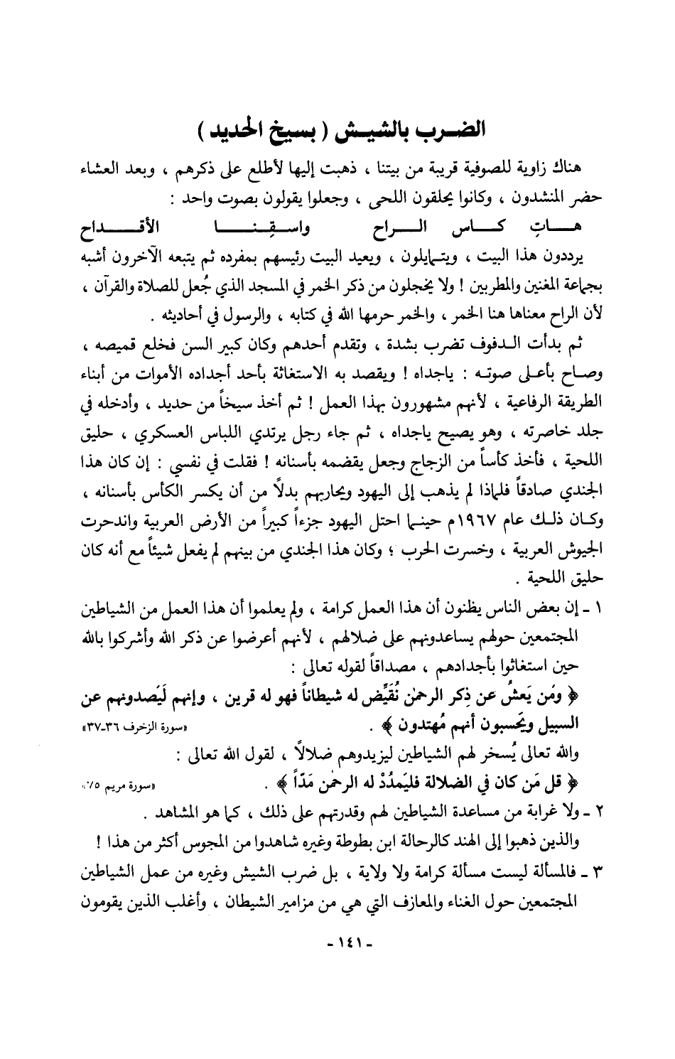 ثم بدأت الدفوف تضرب بشدة، وتقدم أحدهم وكان كبير السن فخلع قميصه، وصاح بأعلى صوته: يا جداه! ويقصد به الإستغاثة بأحد أجداده الأموات من أبناء الطريقة الرفاعية؛ لأنهم مشهورون بهذا العمل! ثم أخذ سيخًا من حديد، وأدخله في جلد خاصرته، وهو يصيح يا جداه، ثم جاء رجل يرتدي اللباس العسكري، حليق اللحية، فأخذ كأسًا من الزجاج وجعل يقضمه بأسنانه! فقلت في نفسي: إن كان هذا الجندي صادقًا فلماذا لم يذهب إلى اليهود ويحاربهم بدلاً من أن يكسر الكأس بأسنانه، وكان ذلك عام 1967 م حينما احتل اليهود جزءًا كبيرًا من الأرض العربية واندحرت الجيوش العربية، وخسرت الحرب، وكان هذا الجندي من بينهم لم يفعل شيئًا مع أنه كان