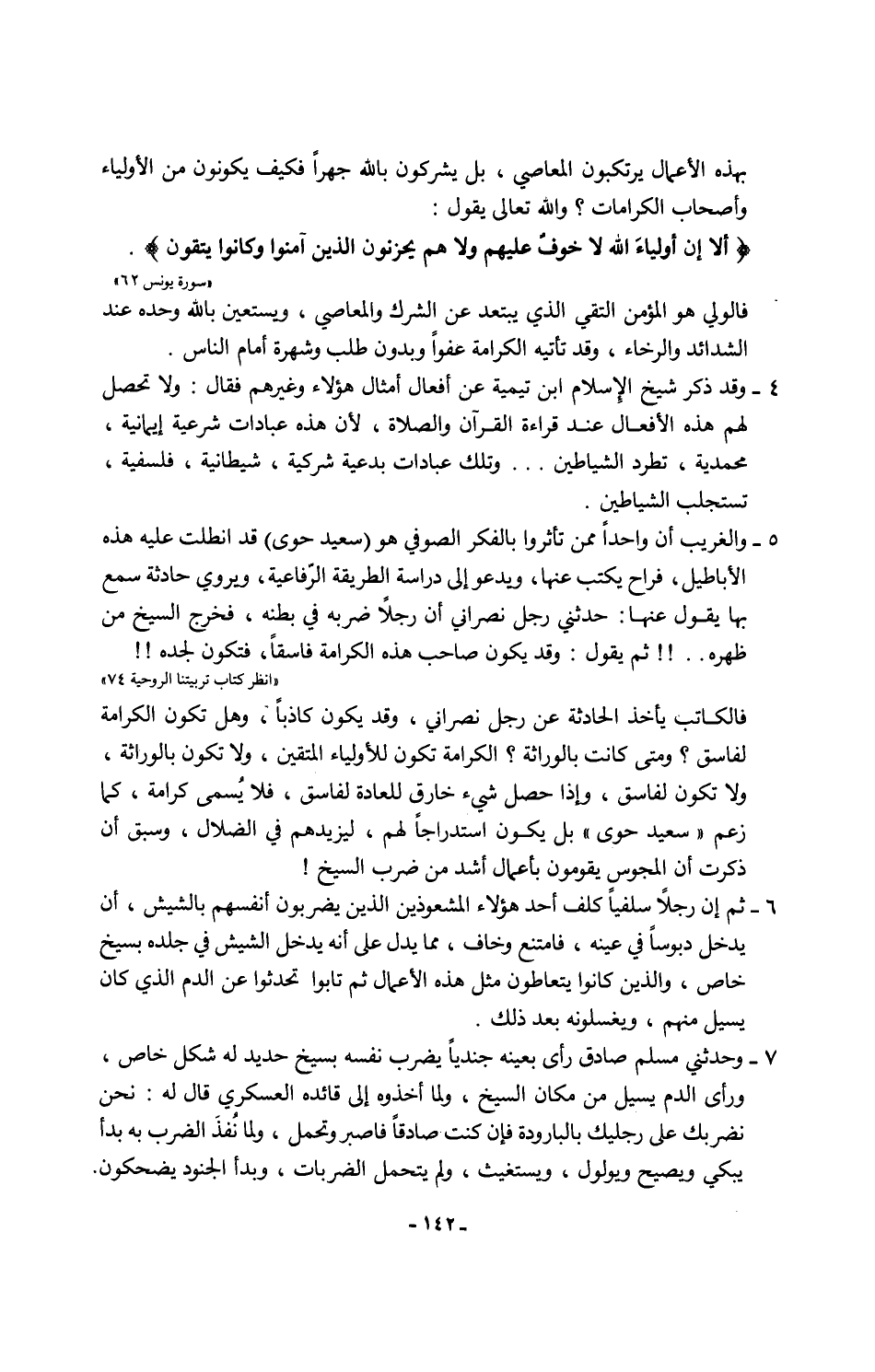 فالكاتب يأخذ الحادثة عن رجل نصراني، وقد يكون كاذبًا، وهل تكون الكرامة لفاسق؟ ومتى كانت بالوراثة؟ الكرامة تكون للأولياء المتقين، ولا تكون بالوراثة، ولا تكون لفاسق، وإذا حصل شيء خارق للعادة لفاسق، فلا يُسمى كرامة، كما زعم "سعيد حوى" بل يكون استدراجًا لهم، ليزيدهم في الضلال، وسبق أن ذكرت أن المجوسِ يقومون بأعمال أشد من ضرب السيخ!