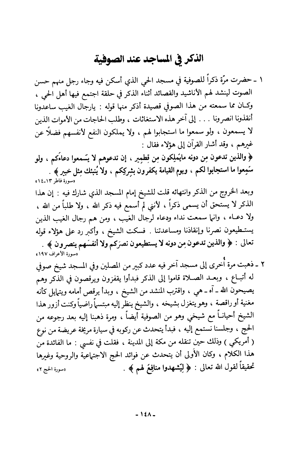 1 - حضرت مرة ذكرًا للصوفية في مسجد الحي الذي أسكن فيه وجاء رجل منهم حسن الصوت لينشد لهم الأناشيد والقصائد أثناء الذكر في حلقة اجتمع فيها أهل الحي، وكان مما سمعته من هذا الصوفي قصيدة أذكر منها قوله: يا رجال الغيب ساعدونا أنقذونا انصرونا. . . إلى آخر هذه الإستغاثات، وطلب الحاجات من الأموات الذين لا يسمعون، ولو سمعوا ما استجابوا لهم، ولا يملكون النفع لأنفسهم فضلًا عن غيرهم، وقد أشار القرآن إلى هؤلاء فقال: