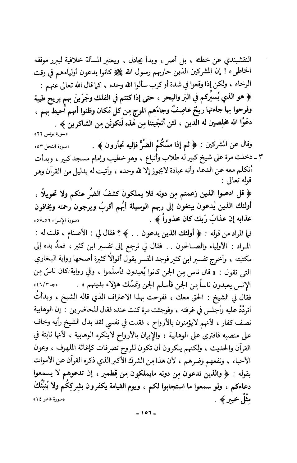 النقشبندي عن خطئه، بل أصر، وبدأ يجادل، ويعتبر المسألة خلافية ليبرر موقفه الخاطىء! إن المشركين الذين حاربهم رسول الله - صلى الله عليه وسلم - كانوا يدعون أولياءهم في وقت الرخاء، ولكن إذا وقعوا في شدة أو كرب سألوا الله وحده، كما قال الله تعالى عنهم: