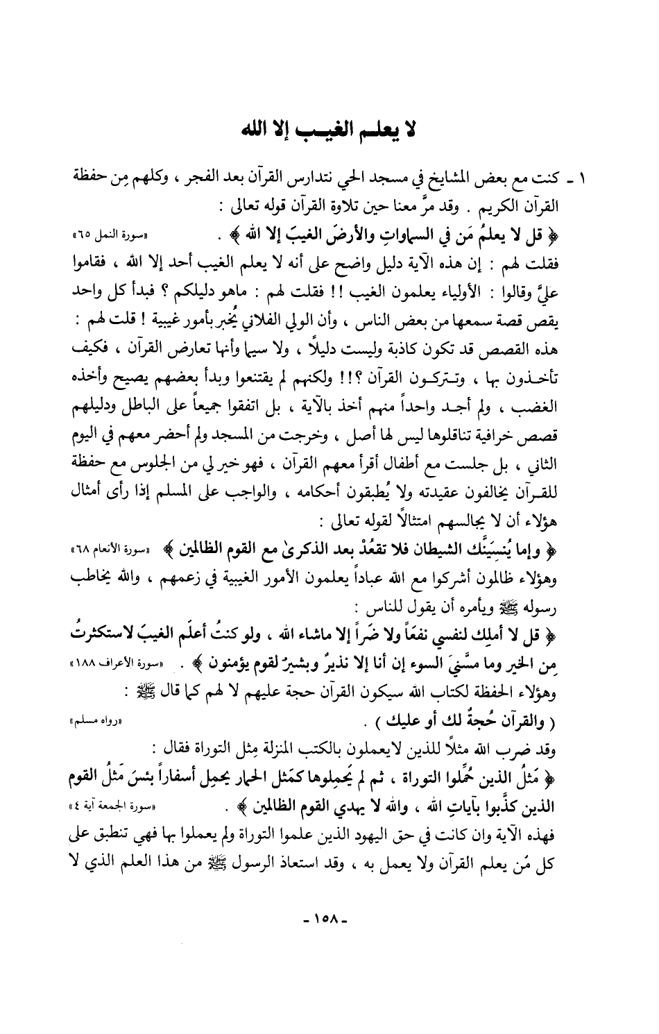 فقلت لهم: إن هذه الآية دليل واضح على أنه لا يعلم الغيب أحد إلا الله، فقاموا عليَّ وقالوا: الأولياء يعلمون الغيب!! فقلت لهم: ما هو دليلكم؟ فبدأ كل واحد يقص قصة سمعها من بعض الناس، وأن الولي الفلاني يُخبر بأمور غيبية! قلت لهم: هذه القصص قد تكون كاذبة وليست دليلًا، ولا سيما وأنها تعارض القرآن، فكيف تأخذون بها، وتتركون القرآن؟!! ولكنهم لم يقتنعوا وبدأ بعضهم يصيح وأخذه الغضب، ولم أجد واحدًا منهم أخذ بالآية، بل اتفقوا جميعًا على الباطل ودليلهم قصص خرافية تناقلوها ليس لها أصل، وخرجت من المسجد ولم أحضر معهم في اليوم الثاني، بل جلست مع أطفال أقرأ معهم القرآن، فهو خير لي من الجلوس مع حفظة للقرآن يخالفون عقيدته ولا يُطبقون أحكامه، والواجب على المسلم إذا رأى أمثال هؤلاء أن لا يجالسهم امتثالًا لقوله تعالى: