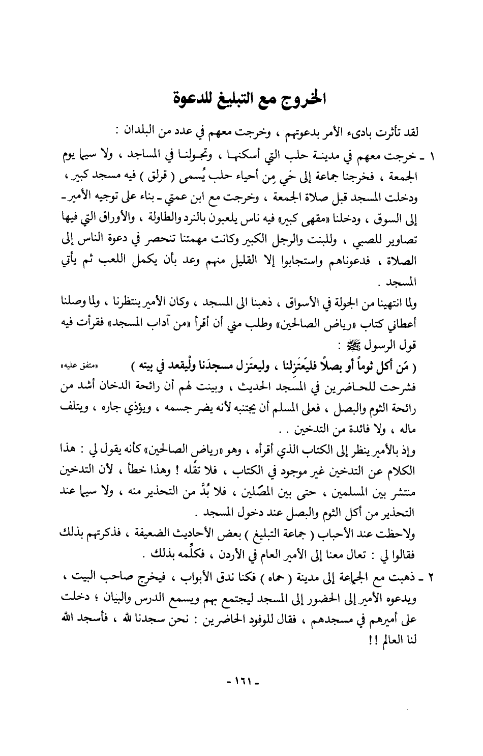 1 - خرجت معهم في مدينة حلب التي أسكنها، وتجولنا في المساجد، ولا سيما يوم الجمعة، فخرجنا جماعة إلى خي مِن أحياء حلب يُسمى (قرلق) فيه مسجد كبير، ودخلت المسجد قبل صلاة الجمعة، وخرجت مع ابن عمتي -بناء على توجيه الأمير- إلى السوق، ودخلنا "مقهى كبير" فيه ناس يلعبون بالنرد والطاولة، والأوراق التي فيها تصاوير للصبي، وللبنت والرجل الكبير وكانت مهمتنا تنحصر في دعوة الناس إلى الصلاة، فدعوناهم واستجابوا إلا القليل منهم وعد بأن يكمل اللعب ثم يأتي المسجد.