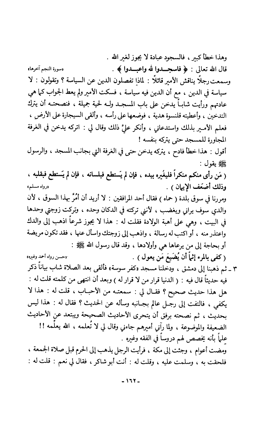 ومررنا في سوق بلدة (حماه) فقال أحد المرافقين: لا أريد أن أمُرَّ بهذا السوق؛ لأن والدي سوف يراني ويغضب؛ لأنني تركته في الدكان وحده، وتركت زوجتي وحدها في البيت، وهي على أهبة الولادة فقلت له: هذا لا يجوز شرعًا اذهب إلى والدك واعتذر منه، أو اكتب له رسالة، واذهب إلى زوجتك واسأل عنها، فقد تكون مريضة أو بحاجة إلى من يرعاها هي وأولادها، وقد قال رسول الله - صلى الله عليه وسلم -:
