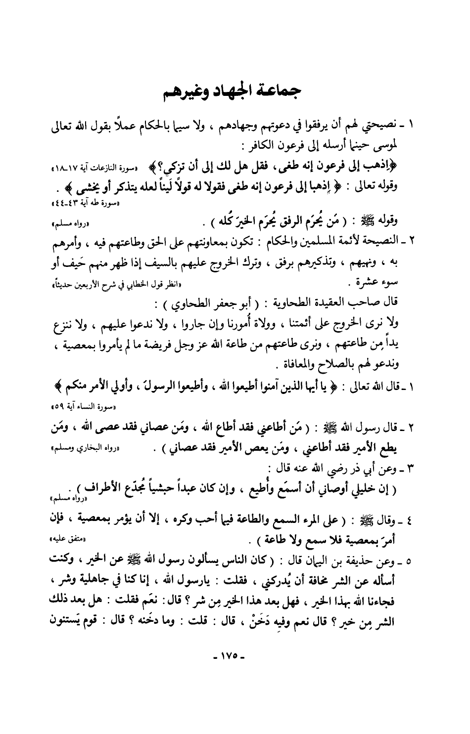 ولا نرى الخروج على أئمتنا، وولاة أُمورنا وإن جاروا، ولا ندعوا عليهم، ولا ننزع يدًا من طاعتهم، ونرى طاعتهم من طاعة الله -عَزَّ وَجَلَّ- فريضة ما لم يأمروا بمعصية، وندعو لهم بالصلاح والمعافاة.