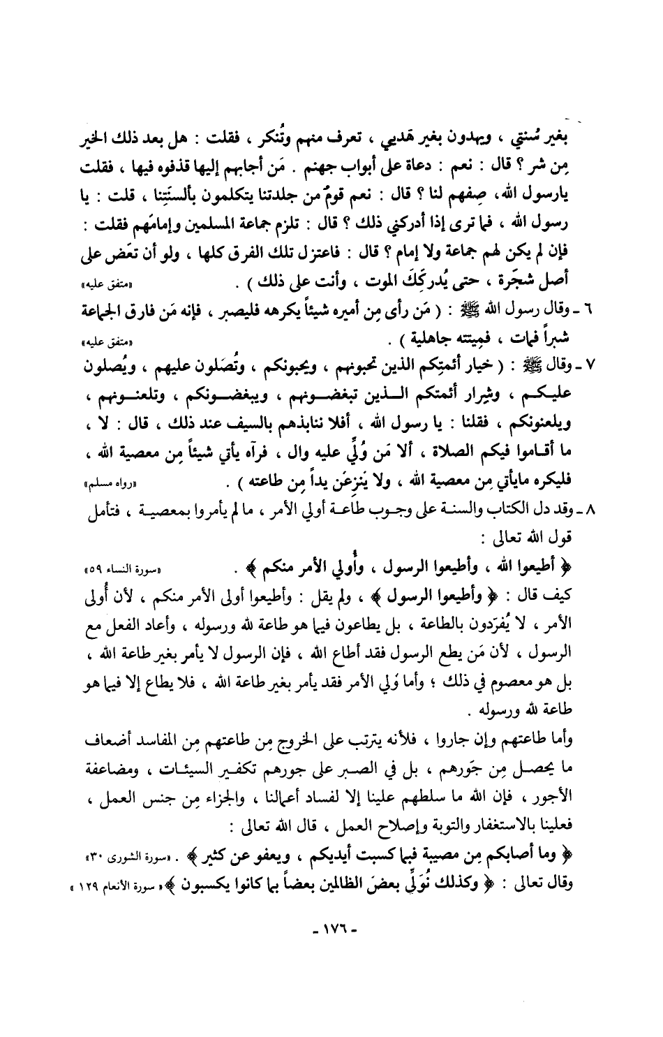 8 - وقد دل الكتاب والسنة على وجوب طاعة أولي الأمر، ما لم يأمروا بمعصية، فتأمل قول الله تعالى: