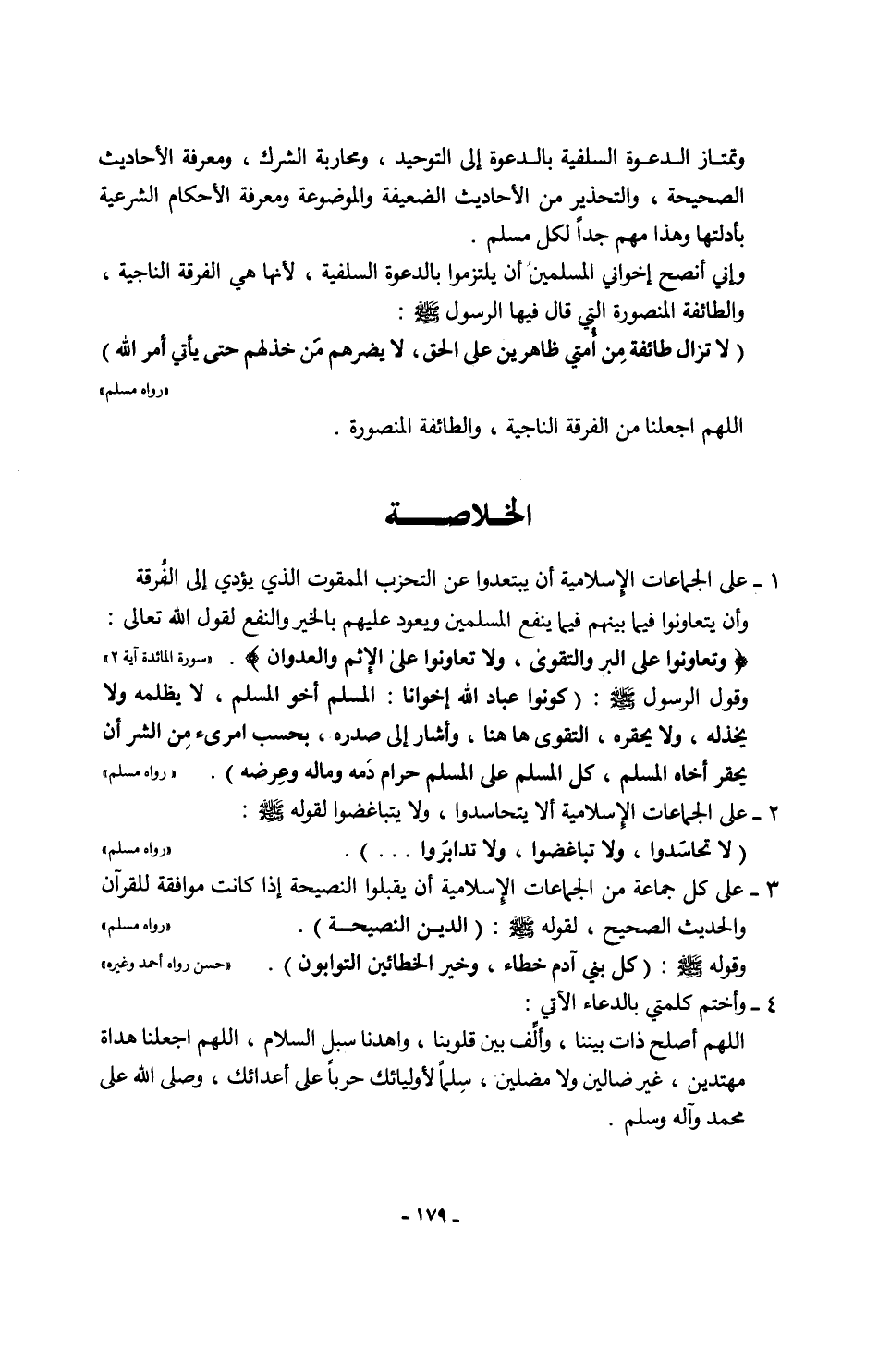 3 - على كل جماعة من الجماعات الإسلامية أن يقبلوا النصيحة إذا كانت موافقة للقرآن والحديث الصحيح، لقوله - صلى الله عليه وسلم -: (الدين النصيحة). "رواه مسلم"