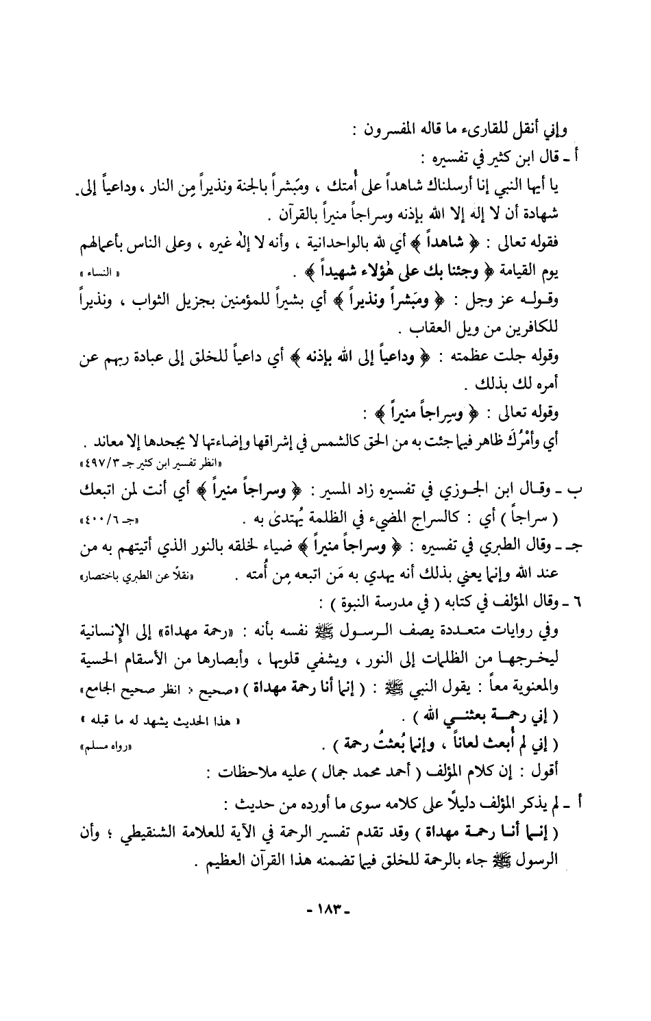 ج - وقال الطبري في تفسيره: {وَسِرَاجًا مُنِيرًا} ضياء لخلقه بالنور الذي أتيتهم به من عند الله وإنما يعني بذلك أنه يهدي به مَن اتبعه مِن أُمته. "نقلاً عن الطبري باختصار"