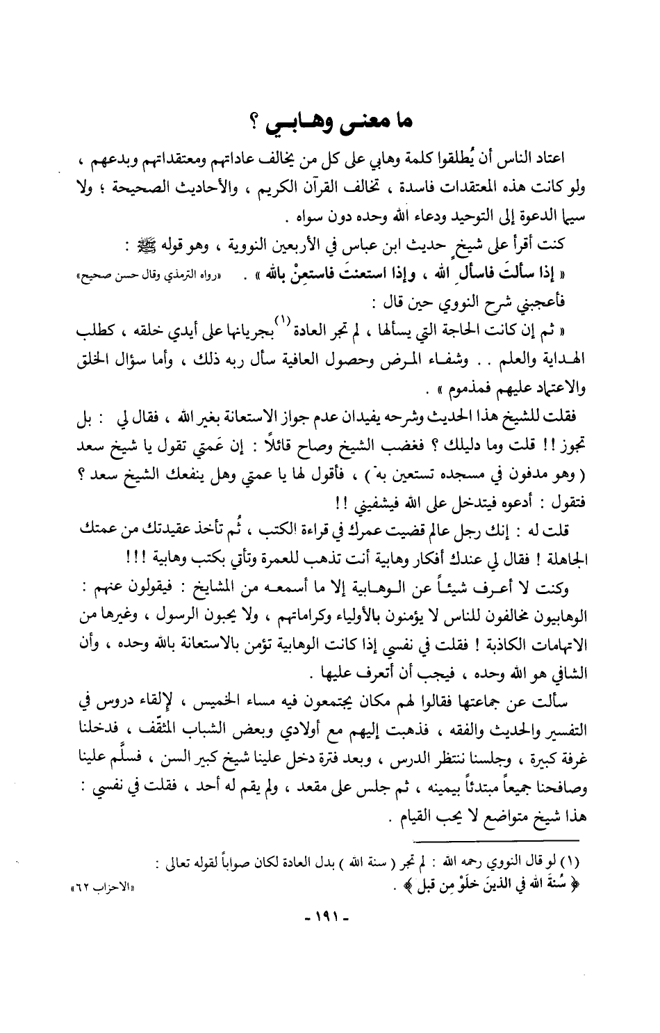 الوهابيون مخالفون للناس لا يؤمنون بالأولياء وكراماتهم، ولا يحبون الرسول، وغيرها من الإتهامات الكاذبة! فقلت في نفسي إذا كانت الوهابية تؤمن بالإستعانة بالله وحده، وأن الشافي هو الله وحده، فيجب أن أتعرف عليها.