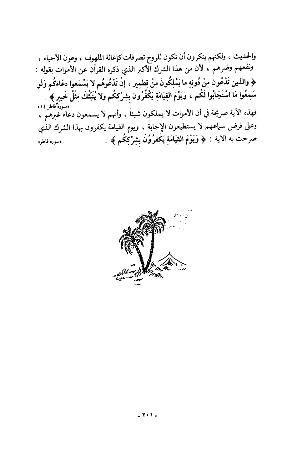 فهذه الآية صريحة في أن الأموات لا يملكون شيئًا، وأنهم لا يسمعون دعاء غيرهم، وعلى فرض سماعهم لا يستطيعون الإِجابة، ويوم القيامة يكفرون بهذا الشرك الذي صرحت به الآية: {وَيَوْمَ الْقِيَامَةِ يَكْفُرُونَ بِشِرْكِكُمْ}. "سورة فاطر"