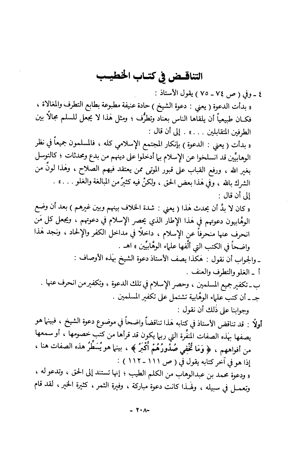 أولًا: قد تناقض الأستاذ في كتابه هذا تناقضًا واضحًا في موضوع دعوة الشيخ، فبينما هو يصفها بهذه الصفات المنفِّرة التي ربما يكون قد قرأها من كتب خصومها، أو سمعها من أفواههم، {وَمَا تُخْفِي صُدُورُهُمْ أَكْبَرُ}، بينما هو يُسَطِّرُ هذه الصفات هنا، إذا هو في آخر كتابه يقول في (ص 111 - 112):