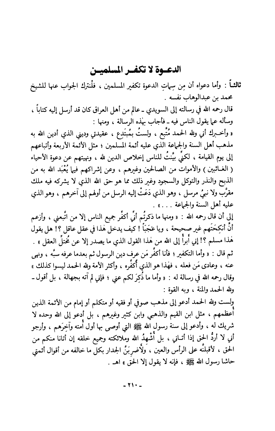 ثم قال: "وأما التكفير، فأنا أكفَر مَن عرف دين الرسول ثم بعدما عرفه سبَّه، ونهى عنه، وعادى مَن فعله، فهذا هو الذي أُكفِّره، وأكثر الأمة ولله الحمد ليسوا كذلك" وقال -رحمه الله- في رسالة له: "وأما ما ذُكِرَ لكم عني، فإني لم آته بجهالة، بل أقول - ولله الحمد والمنة، وبه القوة: