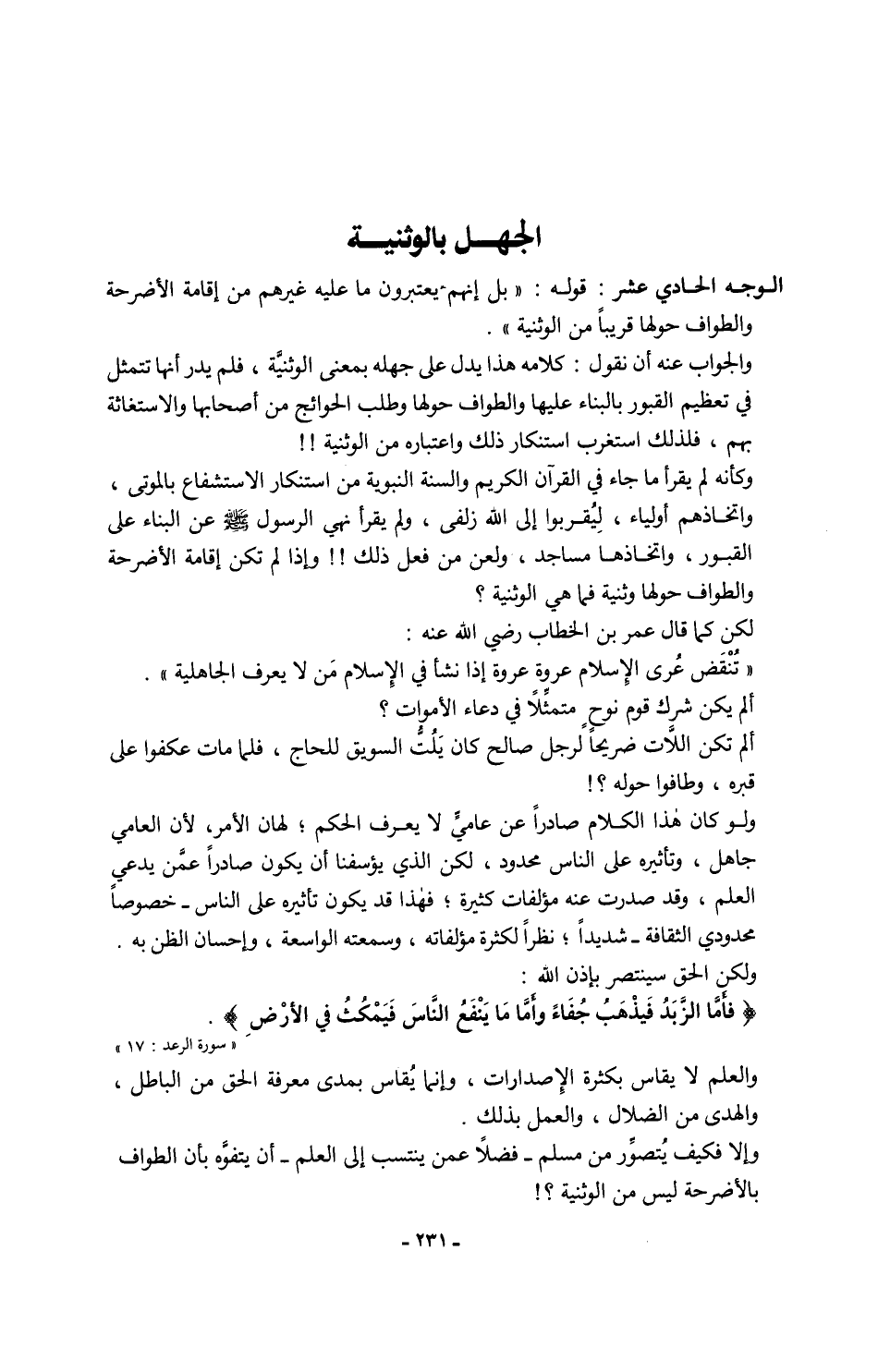 وإلا فكيف يُتصوَّر من مسلم -فضلًا عمن ينتسب إلى العلم- أن يتفوَّه بأن الطواف بالأضرحة ليس من الوثنية؟!