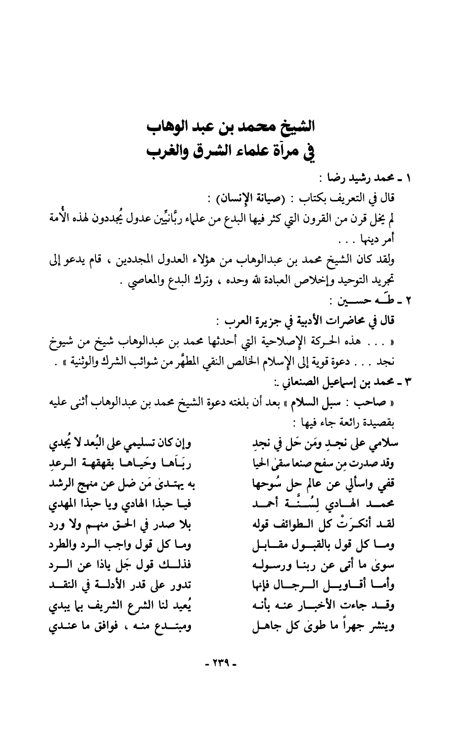 "صاحب: سبل السلام" بعد أن بلغته دعوة الشيخ محمد بن عبد الوهاب أثنى عليه بقصيدة رائعة جاء فيها: