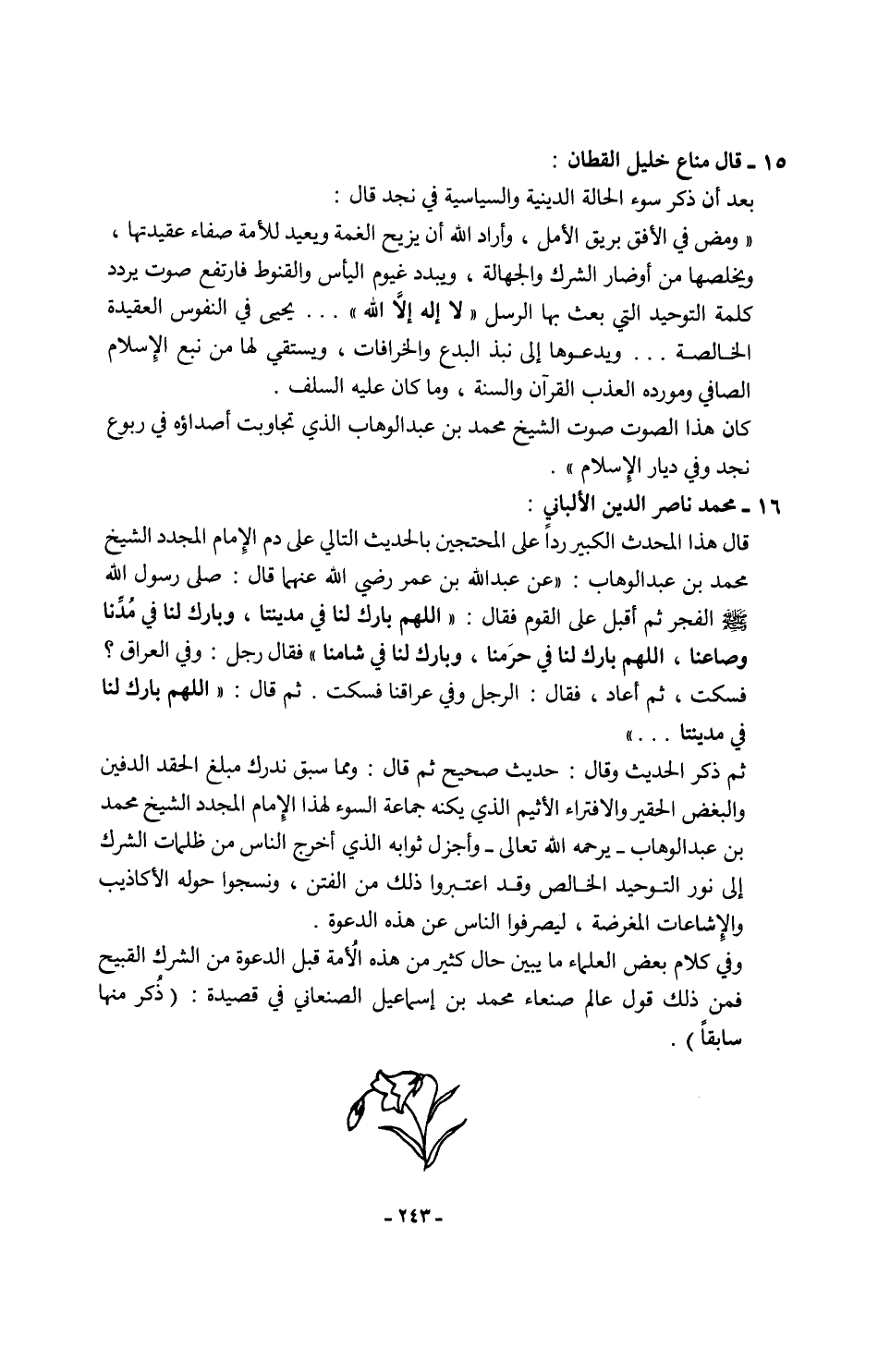 كان هذا الصوت صوت الشيخ محمد بن عبد الوهاب الذي تجاوبت أصداؤه في ربوع نجد وفي ديار الإِسلام".