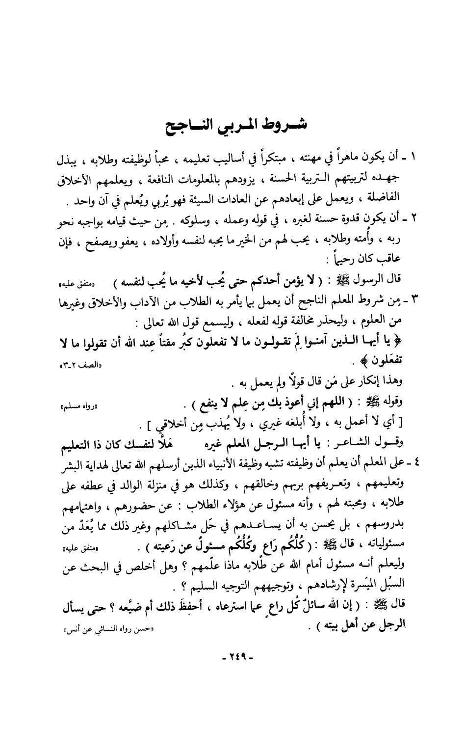 1 - أن يكون ماهرًا في مهنته، مبتكرًا في أساليب تعليمه، محبًا لوظيفته وطلابه، يبذل جهده لتربيتهم التربية الحسنة، يزودهم بالمعلومات النافعة، ويعلمهم الأخلاق الفاضلة، ويعمل على إبعادهم عن العادات السيئة فهو يُربي ويُعلم في آن واحد.