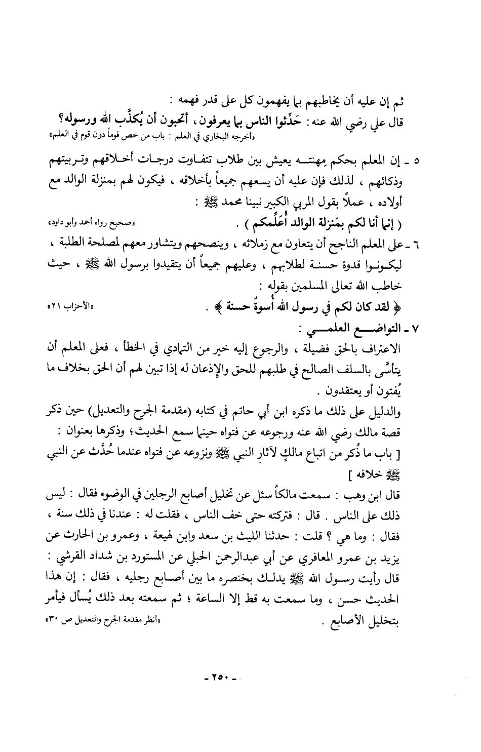 5 - إن المعلم بحكم مِهنته يعيش بين طلاب تتفاوت درجات أخلاقهم وتربيتهم وذكائهم، لذلك فإن عليه أن يسعهم جميعًا بأخلاقه، فيكون لهم بمنزلة الوالد مع أولاده، عملاً بقول المربي الكبير نبيّنا محمد - صلى الله عليه وسلم -: