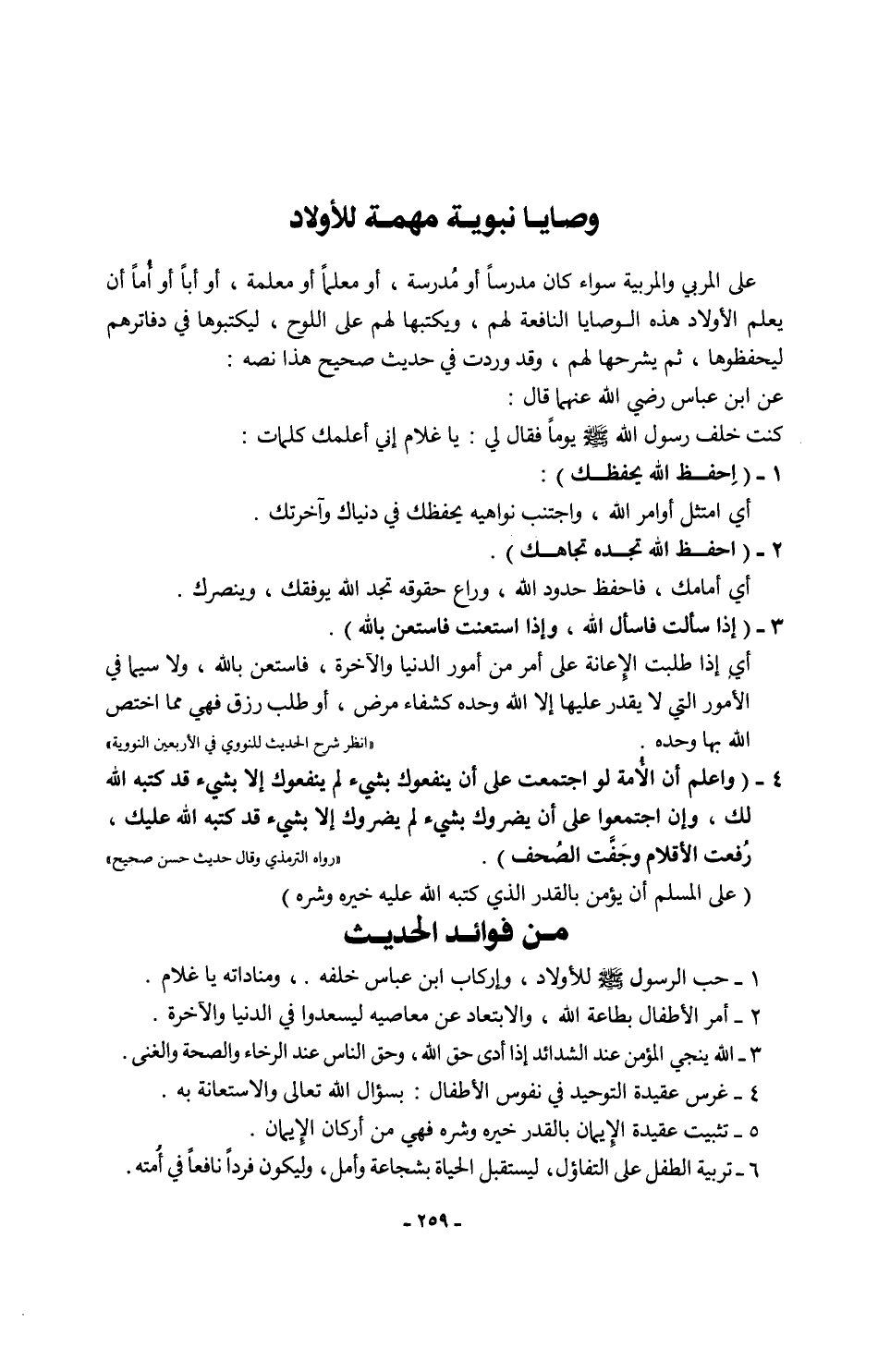 على المربي والمربية سواء كان مدرسًا أو مُدرسة، أو معلمًا أو معلمة، أو أبًا أو أُمًا أن يعلم الأولاد هذه الوصايا النافعة لهم، ويكتبها لهم على اللوح، ليكتبوها في دفاترهم ليحفظوها، ثم يشرحها لهم، وقد وردت في حديث صحيح هذا نصه: عن ابن عباس -رضي الله عنهما- قال: