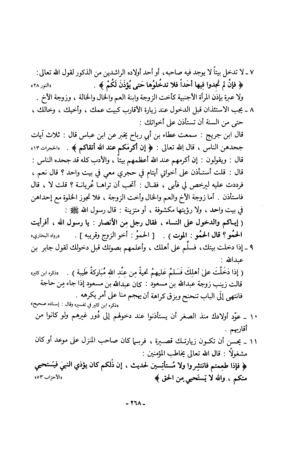 8 - يجب الإستئذان قبل الدخول عند زيارة الأقارب كبيت عمك، وأخيك، وخالك، حتى من السنة أن تستأذن على أخواتك: