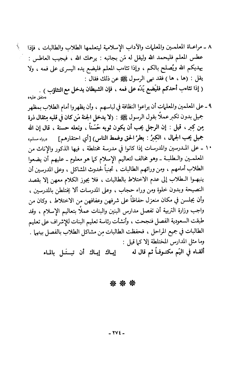 10 - على المدرسين والمدرسات إذا كانوا في مدرسة مختلطة، فيها الذكور والإِناث من المعلمين والطلبة - وهو مخالف لتعاليم الإِسلام كما هو معلوم - عليهم أن يضعوا الطلاب أمامهم، ومن ورائهم الطالبات، تجنبًا لحدوث المشاكل، وعلى المدرسين أن ينبهوا الطلاب إلى عدم الإختلاط بالطالبات، فلا يجوز الكلام معهن إِلا بقصد النصيحة وبدون خلوة ومن وراء حجاب، وعلى المدرسات ألا يختلطن بالمدرسين، وأن يجلسن في مكان منعزل حفاظًا على شرفهن وعفافهن من الإختلاط، وكان من واجب وزارة التربية أن تفصل مدارس البنين والبنات عملاً بتعاليم الإِسلام، وقد طبقت السعودية الفصل فنجحت، وأنشات رئاسة تعليم البنات للإشراف على تعليم الطالبات في جميع المراحل، فحفظت الطالبات مِن مشاكل الطلاب بالفصل بينهما. وما مثل المدارس المختلطة إِلا كما قيل: