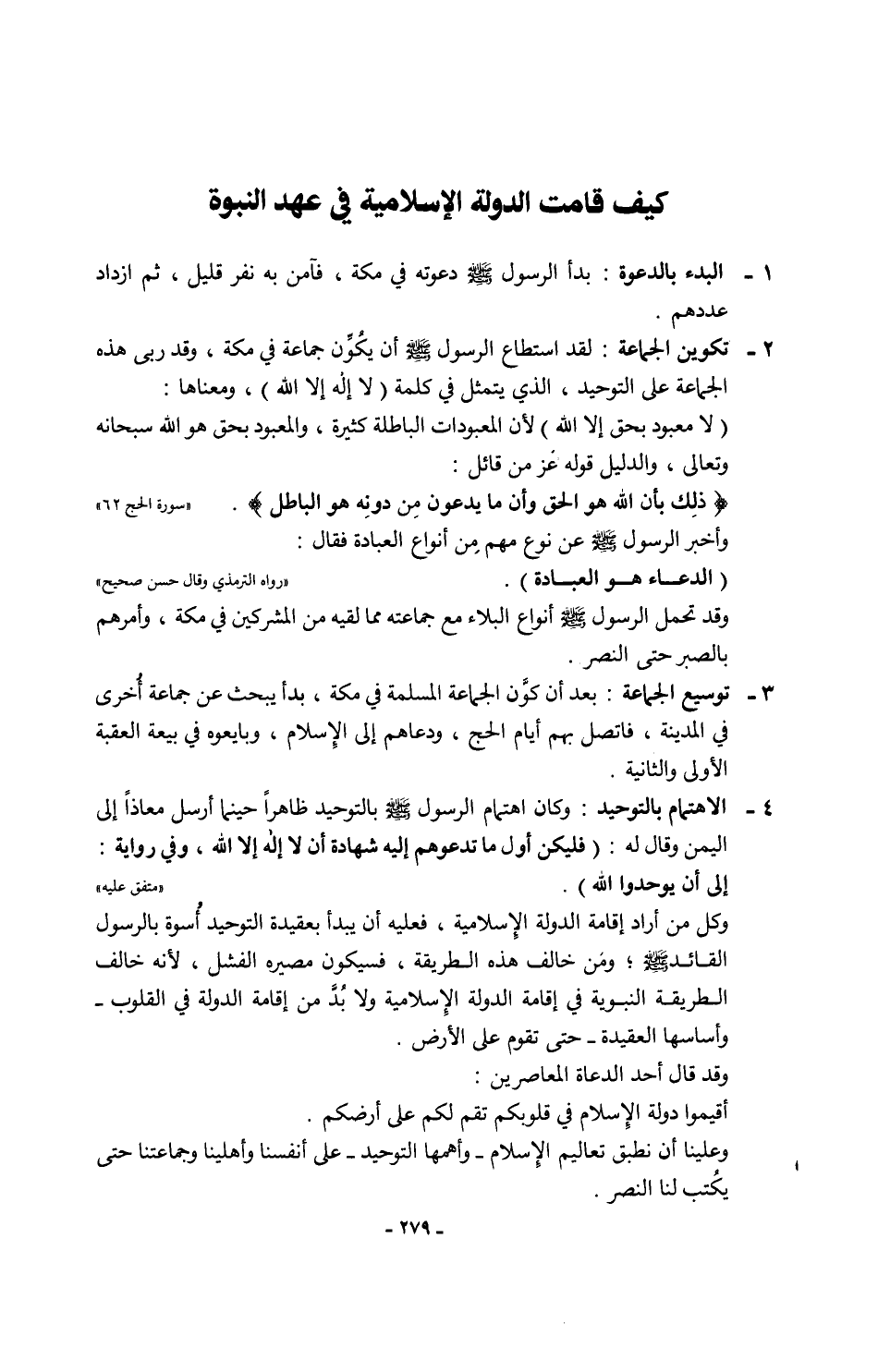 وكل من أراد إقامة الدولة الإِسلامية، فعليه أن يبدأ بعقيدة التوحيد أُسوة بالرسول القائد - صلى الله عليه وسلم -؛ ومَن خالف هذه الطريقة، فسيكون مصيره الفشل، لأنه خالف الطريقة النبوية في إقامة الدولة الإِسلامية ولا بُدَّ من إقامة الدولة في القلوب -وأساسها العقيدة- حتى تقوم على الأرض.