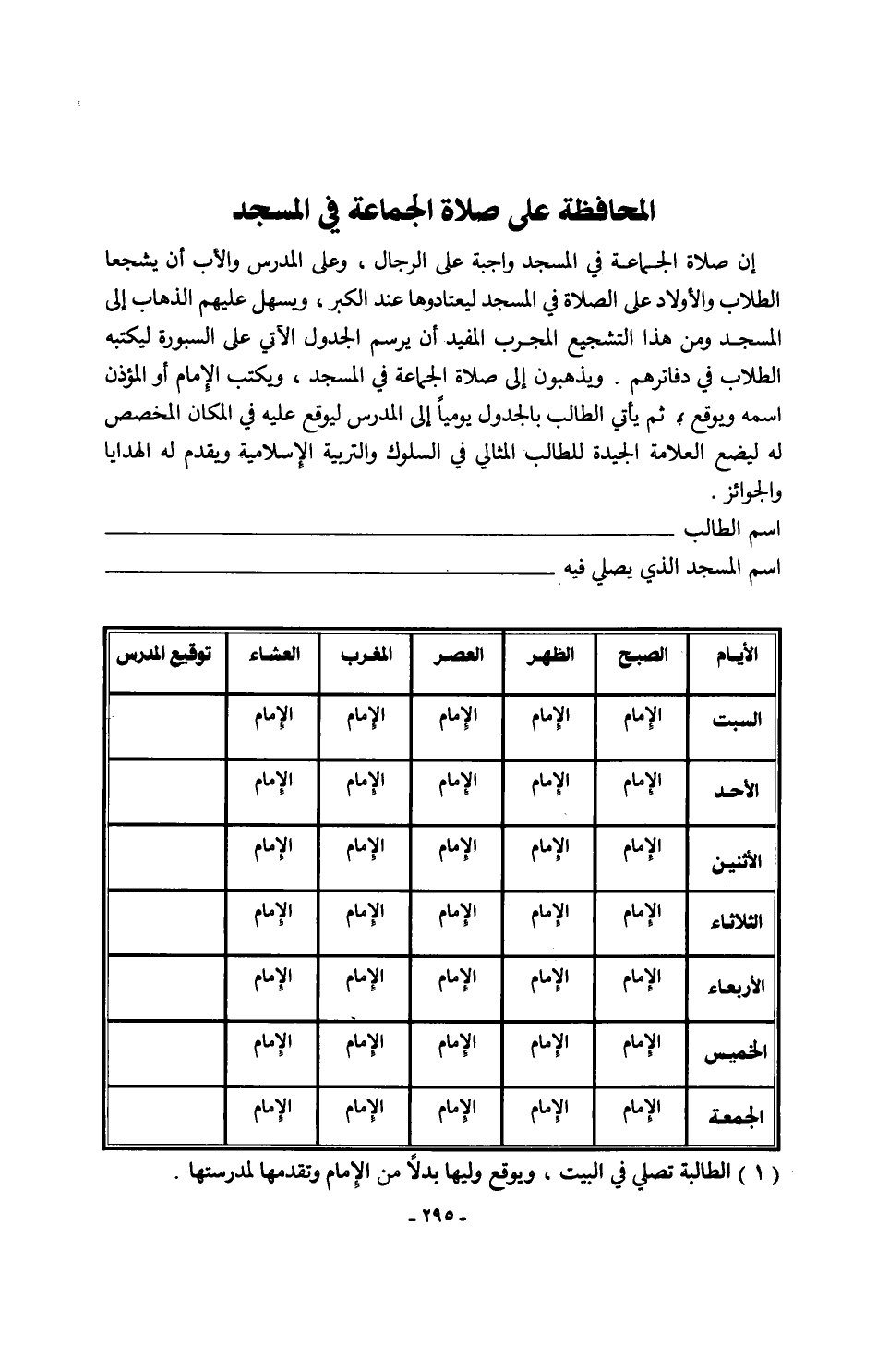 إن صلاة الجماعة في المسجد واجبة على الرجال، وعلى المدرس والأب أن يشجعا الطلاب والأولاد على الصلاة في المسجد ليعتادوها عند الكبر، ويسهل عليهم الذهاب إلى المسجد ومن هذا التشجيع المجرب المفيد أن يرسم الجدول الآتي على السبورة ليكتبه الطلاب في دفاترهم. ويذهبون إلى صلاة الجماعة في المسجد، ويكتب الإِمام أو المؤذن اسمه ويوقع (¬1)، ثم يأتي الطالب بالجدول يوميًا إلى المدرس ليوقع عليه في المكان المخصص له ليضع العلامة الجيدة للطالب المثالي في السلوك والتربية الإِسلامية ويقدم له الهدايا والجوائز.