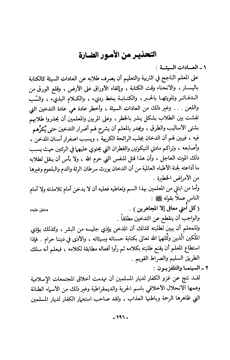 وأما من ابتلي من المعلمين بهذا السم وتعاطيه فعليه أن لا يدخن أمام تلامذته ولا أمام الناس عملاً بقوله - صلى الله عليه وسلم -:
