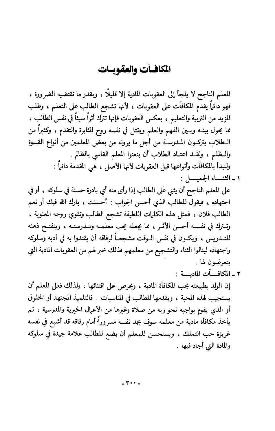 المعلم الناجح لا يلجا إلى العقوبات المادية إِلا قليلًا، وبقدر ما تقتضيه الضرورة، فهو دائمًا يقدم المكافآت على العقوبات، لأنها تشجع الطالب على التعلم، وطلب المزيد من التريية والتعليم، بعكس العقوبات فإنها تترك أثرًا سيئًا في نفس الطالب، مما يحول بينه وبين الفهم والعلّم ويقتل في نفسه روح المثابرة والتقدم، وكثيرًا من الطلاب يتركون المدرسة من أجل ما يرونه من بعض المعلمين من أنواع القسوة والظلم، ولقد اعتاد الطلاب أن ينعتوا المعلم القاسي بالظالم.