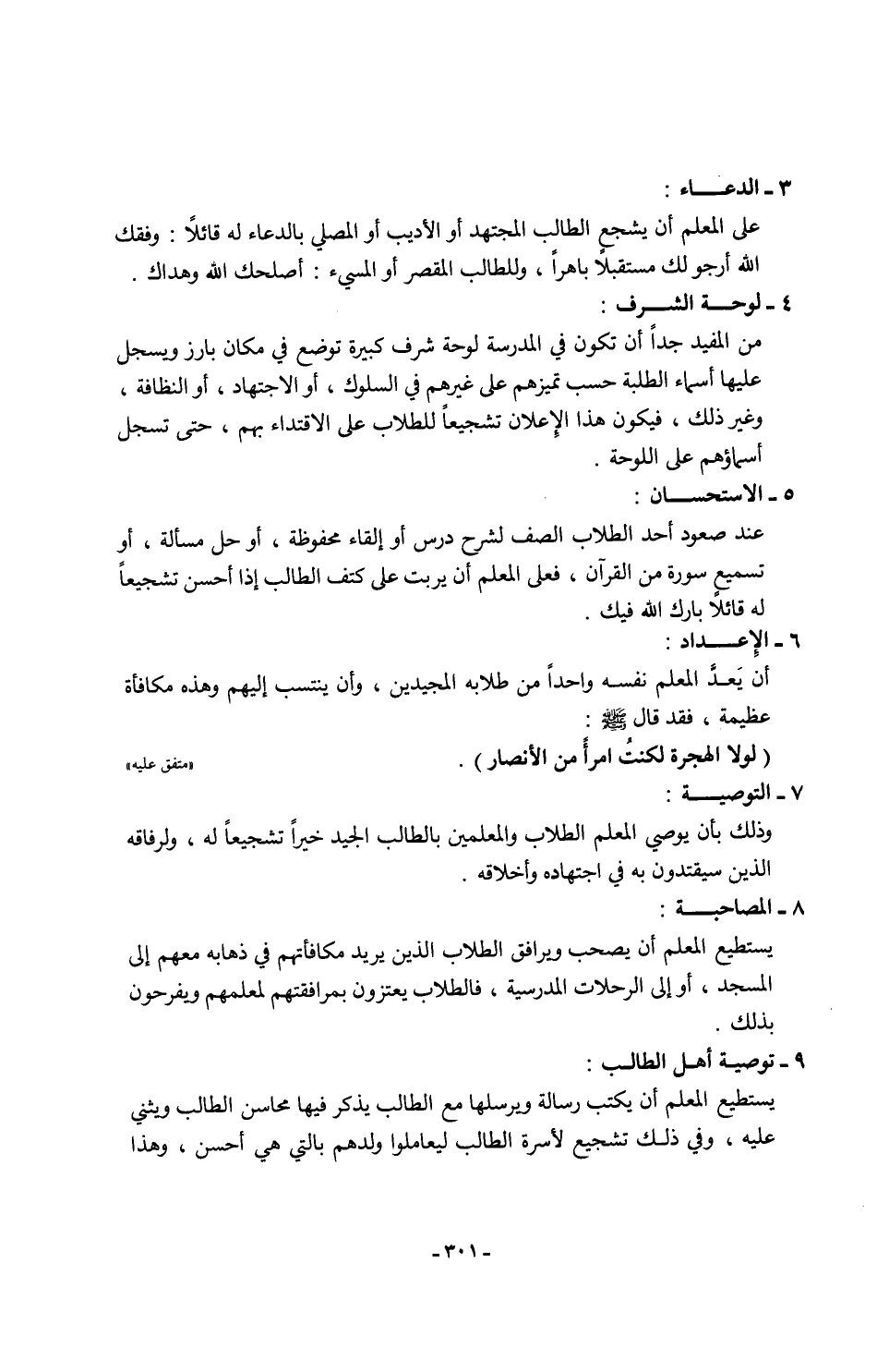 على المعلم أن يشجع الطالب المجتهد أو الأديب أو المصلي بالدعاء له قائلًا: وفقك الله أرجو لك مستقبلًا باهرًا، وللطالب المقصر أو المسيء: أصلحك الله وهداك.