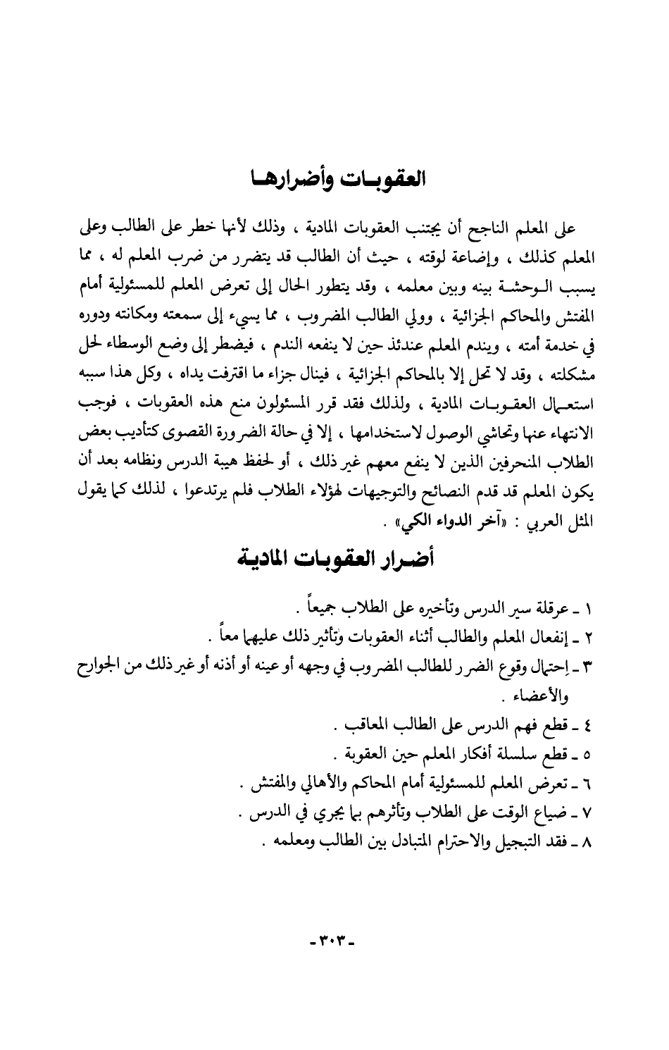 على المعلم الناجح أن يجتنب العقوبات المادية، وذلك لأنها خطر على الطالب وعلى المعلم كذلك، وإضاعة لوقته، حيث أن الطالب قد يتضرر من ضرب المعلم له، مما يسبب الوحشة بينه وبين معلمه، وقد يتطور الحال إلى تعرض المعلم للمسئولية أمام المفتش والمحاكم الجزائية، وولي الطالب المضروب، مما يسيء إلى سمعته ومكانته ودوره في خدمة أمته، ويندم المعلم عندئذ حين لا ينفعه الندم، فيضطر إلى وضع الوسطاء لحل مشكلته، وقد لا تحل إِلا بالمحاكم الجزائية، فينال جزاء ما اقترفت يداه، وكل هذا سببه استعمال العقوبات المادية، ولذلك فقد قرر المسئولون منع هذه العقوبات، فوجب الإنتهاء عنها وتحاشي الوصول لاستخدامها، إِلا في حالة الضّرورة القصوى كتأديب بعض الطلاب المنحرفين الذين لا ينفع معهم غير ذلك، أو لحفظ هيبة الدرس ونظامه بعد أن يكون المعلم قد قدم النصائح والتوجيهات لهؤلاء الطلاب فلم يرتدعوا، لذلك كما يقول المثل العربي: "آخر الدواء الكي".
