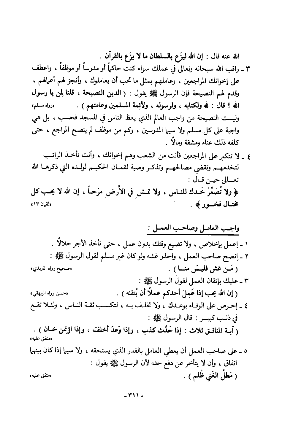 5 - على صاحب العمل أن يعطي العامل بالقدر الذي يستحقه، ولا سيما إذا كان بينهما اتفاق، وأن لا يتأخر عن دفع حقه لأن الرسول - صلى الله عليه وسلم - يقول: (مَطلُ الغَني ظْلم). "متفق عليه"