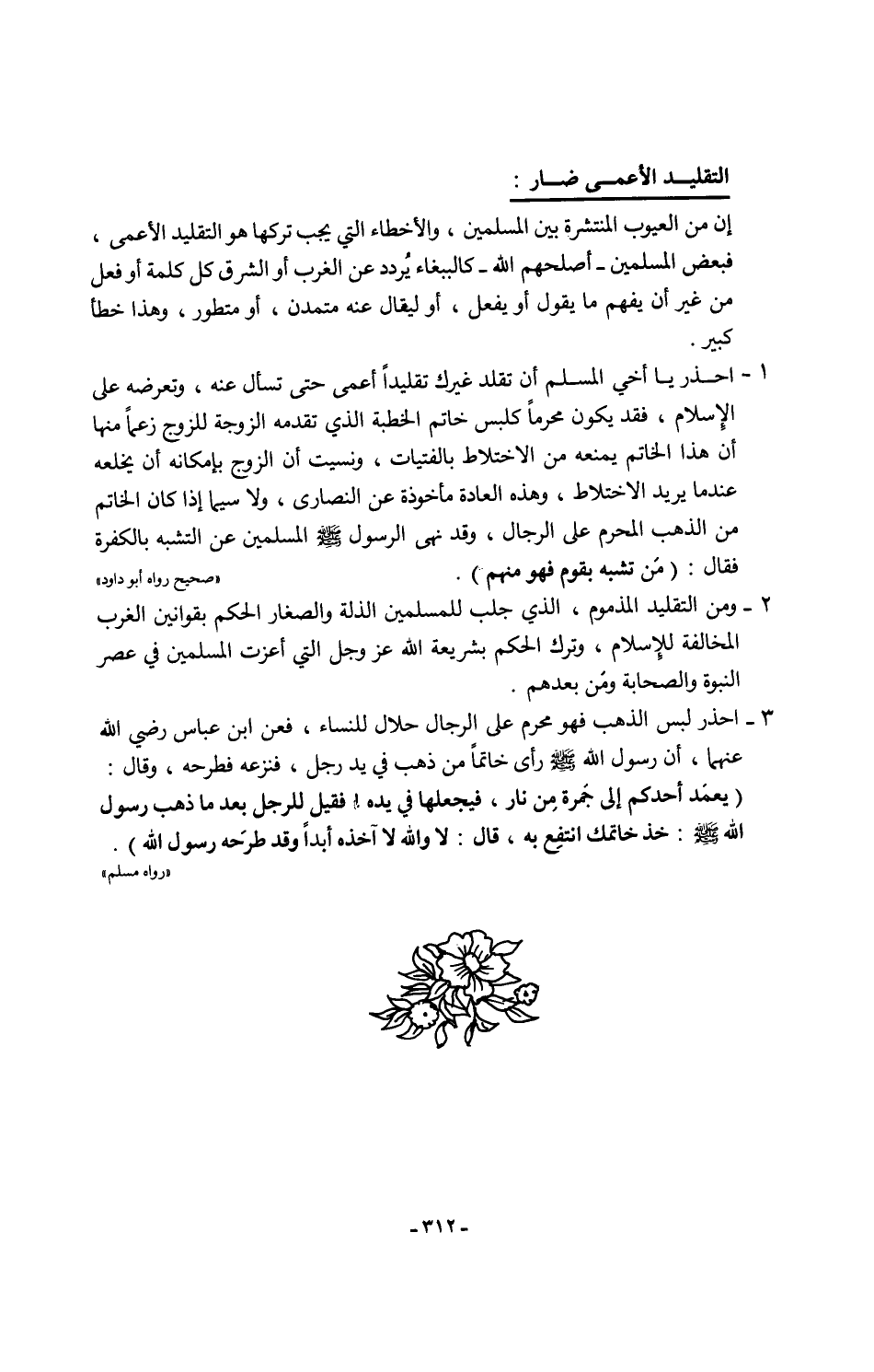 1 - احذر يا أخي المسلم أن تقلد غيرك تقليدًا أعمى حتى تسأل عنه، وتعرضه على الإِسلام، فقد يكون محرمًا كلبس خاتم الخطبة الذي تقدمه الزوجة للزوج زعمًا منها أن هذا الخاتم يمنعه من الإختلاط بالفتيات، ونسيت أن الزوج بإمكانه أن يخلعه عندما يريد الإختلاط، وهذه العادة مأخوذة عن النصارى، ولا سيما إذا كان الخاتم من الذهب المحرم على الرجال، وقد نَهَى الرسول - صلى الله عليه وسلم - المسلمين عن التشبه بالكفرة فقال: (مَن تشبه بقوم فهو منهم). "صحيح رواه أبو داود"