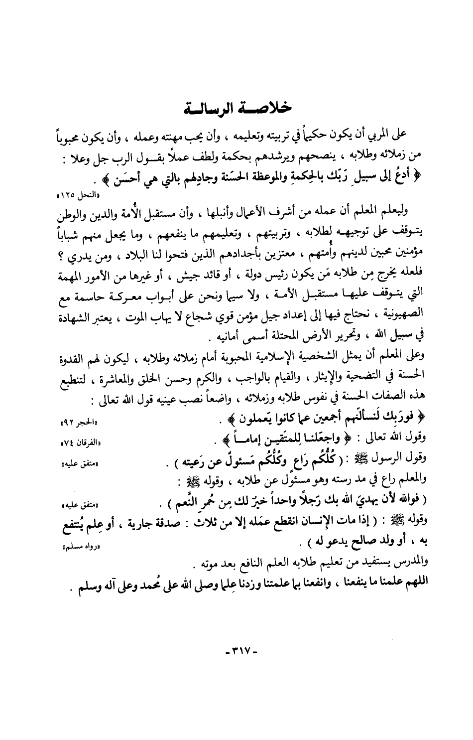 وليعلم المعلم أن عمله من أشرف الأعمال وأنبلها، وأن مستقبل الأُمة والدين والوطن يتوقف على توجيهه لطلابه، وتربيتهم، وتعليمهم ماينفعهم، وما يجعل منهم شبابًا مؤمنين محبين لدينهم وأُمتهم، معتزين بأجدادهم الذين فتحوا لنا البلاد، ومن يدري؟ فلعله يخرج مِن طلابه مَن يكون رئس دولة، أو قائد جيش، أو غيرها من الأمور المهمة التي يتوقف عليها مستقبل الأمة، ولا سيما ونحن على أبواب معركة حاسمة مع الصهيونية، نحتاج فيها إلى إعداد جيل مؤمن قوي شجاع لا يهاب الموت، يعتبر الشهادة في سبيل الله، وتحرير الأرض المحتلة أسمى أمانيه.
