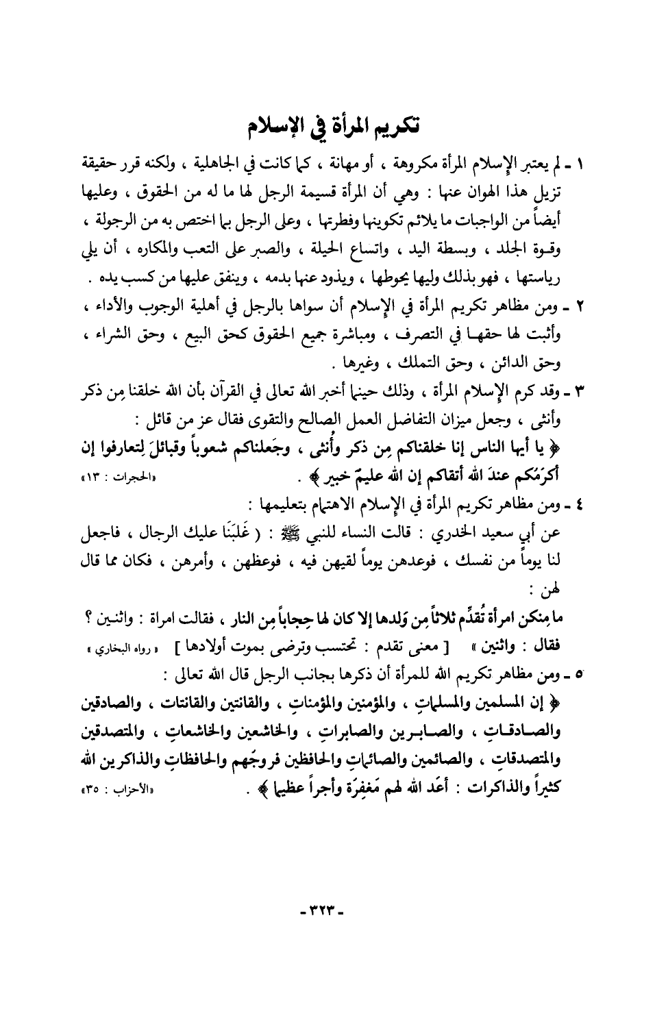 3 - وقد كرم الإِسلام المرأة، وذلك حينما أخبر الله تعالى في القرآن بأن الله خلقنا من ذكر وأنثى، وجعل ميزان التفاضل العمل الصالح والتقوى فقال عز من قائل: {يَا أَيُّهَا النَّاسُ إِنَّا خَلَقْنَاكُمْ مِنْ ذَكَرٍ وَأُنْثَى وَجَعَلْنَاكُمْ شُعُوبًا وَقَبَائِلَ لِتَعَارَفُوا إِنَّ أَكْرَمَكُمْ عِنْدَ اللَّهِ أَتْقَاكُمْ إِنَّ اللَّهَ عَلِيمٌ خَبِيرٌ} [الحجرات: 13]
