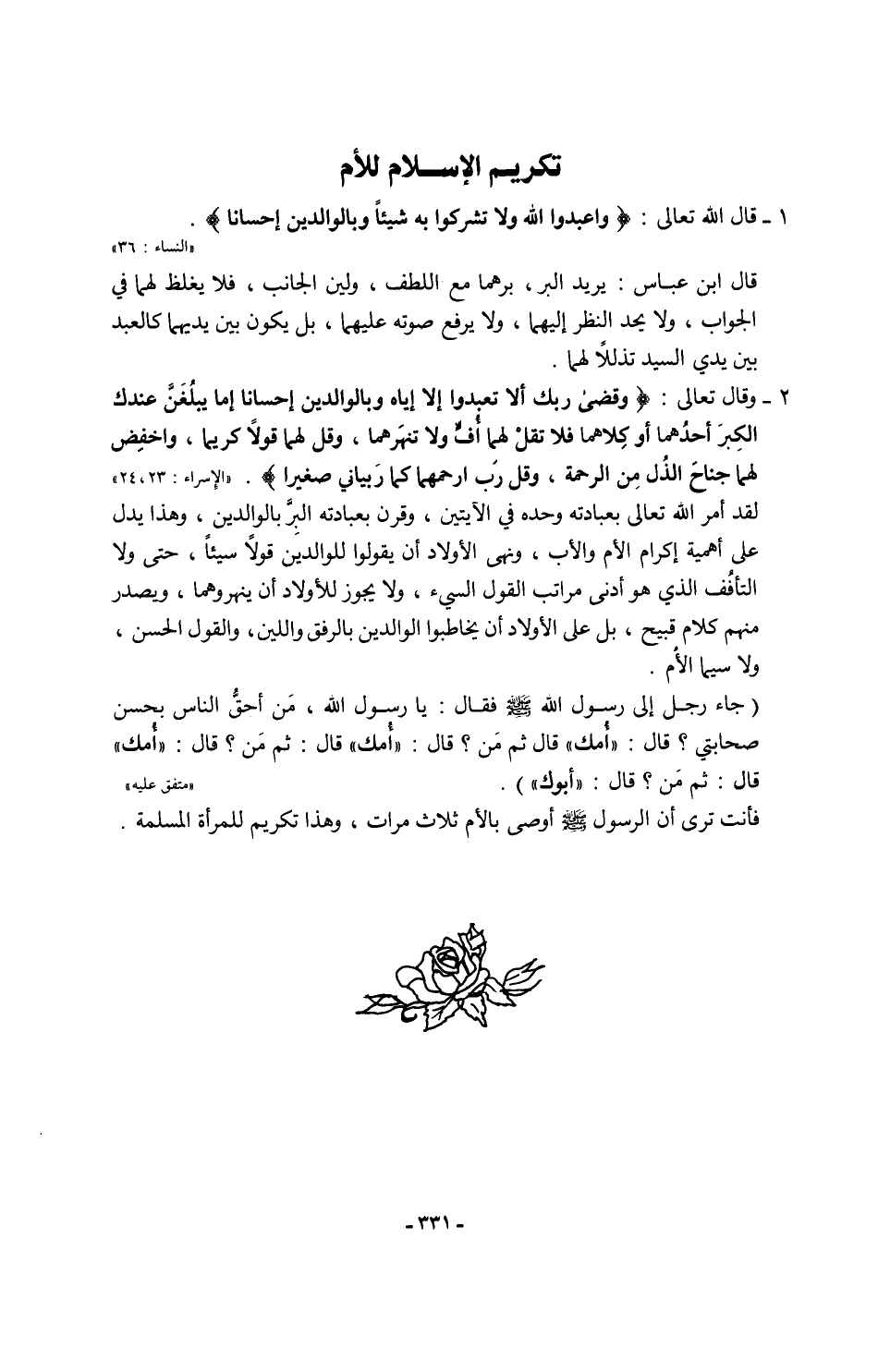 2 - وقال تعالى: {وَقَضَى رَبُّكَ أَلَّا تَعْبُدُوا إِلا إِيَّاهُ وَبِالْوَالِدَيْنِ إِحْسَانًا إِمَّا يَبْلُغَنَّ عِنْدَكَ الْكِبَرَ أَحَدُهُمَا أَوْ كِلَاهُمَا فَلَا تَقُلْ لَهُمَا أُفٍّ وَلَا تَنْهَرْهُمَا وَقُلْ لَهُمَا قَوْلًا كَرِيمًا (23) وَاخْفِضْ لَهُمَا جَنَاحَ الذُّلِّ مِنَ الرَّحْمَةِ وَقُلْ رَبِّ ارْحَمْهُمَا كَمَا رَبَّيَانِي صَغِيرًا} [الإسراء: 23، 24]