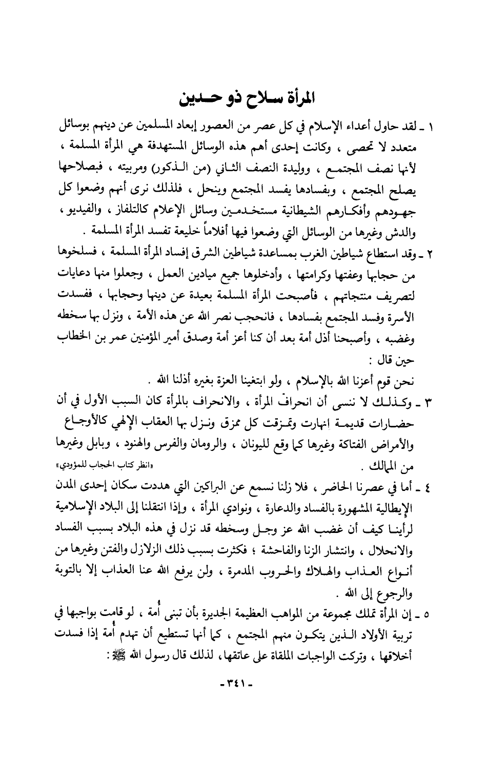 1 - لقد حاول أعداء الإِسلام في كل عصر من العصور إبعاد المسلمين عن دينهم بوسائل متعدد لا تحصى، وكانت إحدى أهم هذه الوسائل المستهدفة هي المرأة المسلمة، لأنها نصف المجتمع، ووليدة النصف الثاني (من الذكور) ومربيته، فبصلاحها يصلح المجتمع، وبفسادها يفسد المجتمع وينحل، فلذلك نرى أنهم وضعوا كل جهودهم وأفكارهم الشيطانية مستخدمين وسائل الإعلام كالتلفاز، والفيديو، والدش وغيرها من الوسائل التي وضعوا فيها أفلامًا خليعة تفسد المرأة المسلمة.