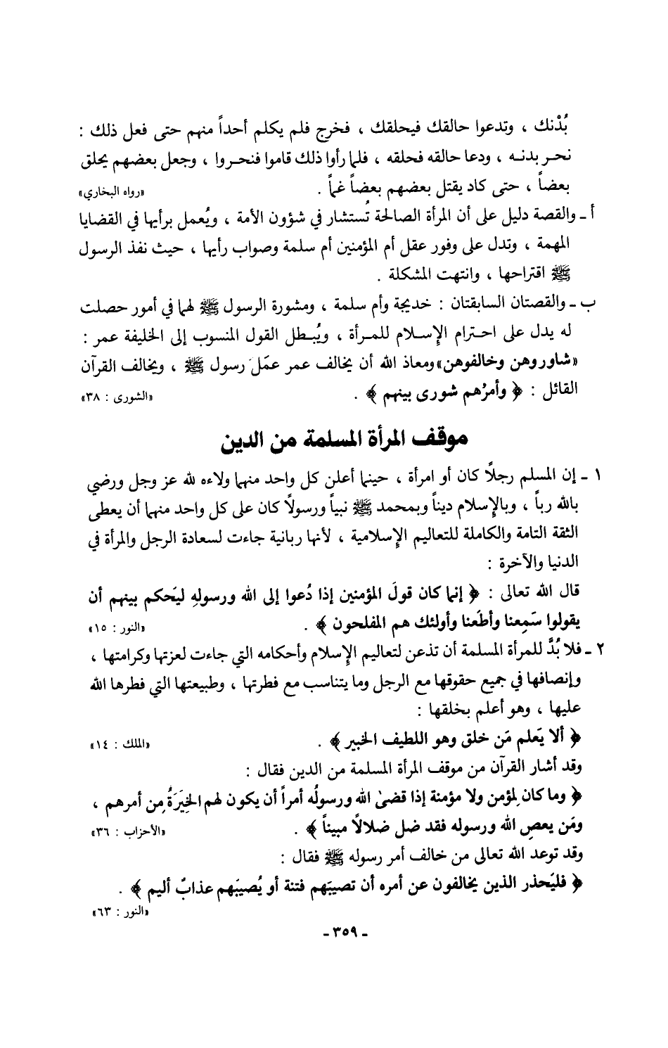 ب - والقصتان السابقتان: خديجة وأم سلمة، ومشورة الرسول - صلى الله عليه وسلم - لهما في أمور حصلت له يدل على احترام الإِسلام للمرأة، ويُبطل القول المنسوب إلى الخليفة عمر: "شاوروهن وخالفوهن" ومعاذ الله أن يخالف عمر عمَلَ رسول - صلى الله عليه وسلم -، ويخالف القرآن القائل: {وَأَمْرُهُمْ شُورَى بَيْنَهُمْ} [الشورى: 38]