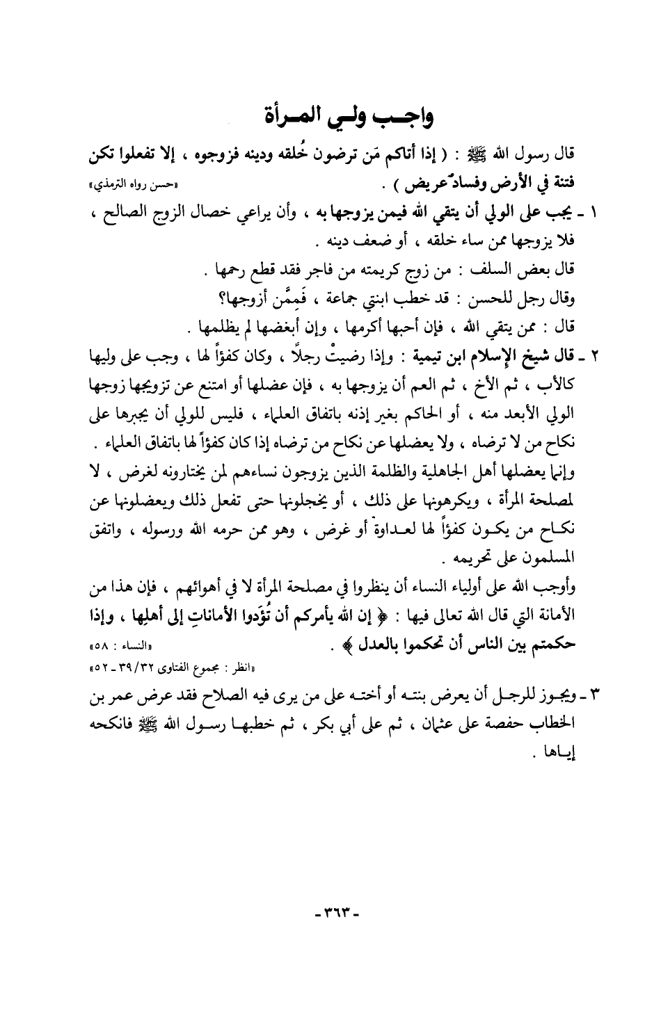 وأوجب الله على أولياء النساء أن ينظروا في مصلحة المرأة لا في أهوائهم، فإن هذا من الأمانة التي قال الله تعالى فيها: {إِنَّ اللَّهَ يَأْمُرُكُمْ أَنْ تُؤَدُّوا الْأَمَانَاتِ إِلى أَهْلِهَا وَإِذَا حَكَمْتُمْ بَيْنَ النَّاسِ أَنْ تَحْكُمُوا بِالْعَدْلِ} [النساء: 58]