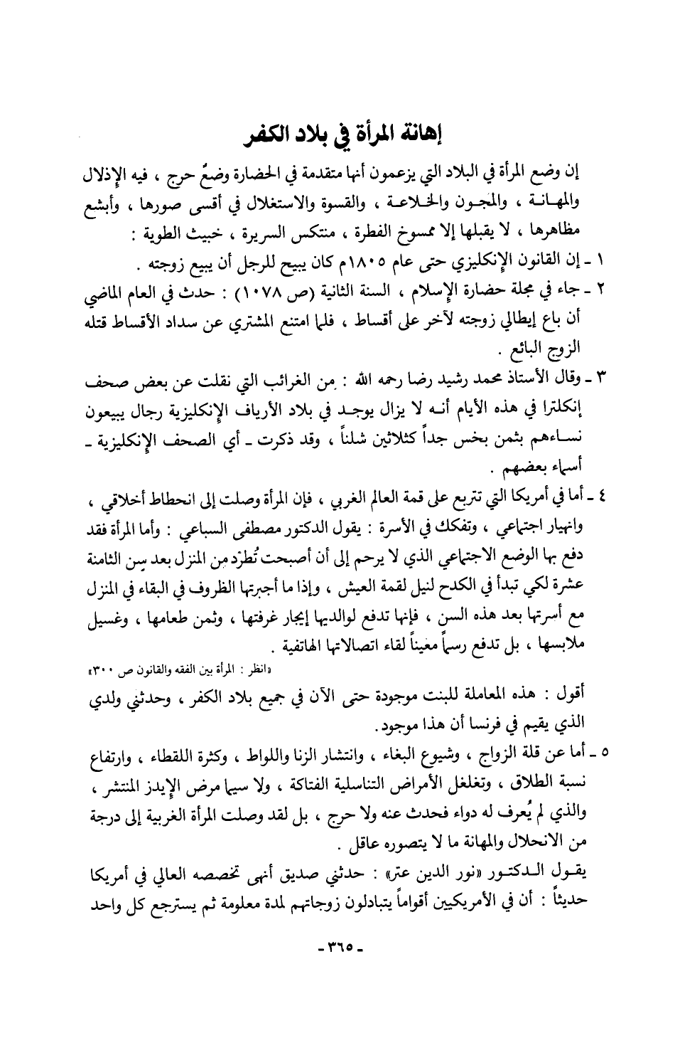 3 - وقال الأستاذ محمد رشيد رضا -رحمه الله-: من الغرائب التي نقلت عن بعض صحف إنكلترا في هذه الأيام أنه لا يزال يوجد في بلاد الأرياف الإِنكليزية رجال يبيعون نساءهم بثمن بخس جدًّا كثلاثين شلنًا، وقد ذكرت - أي الصحف الإنكليزية- أسماء بعضهم.