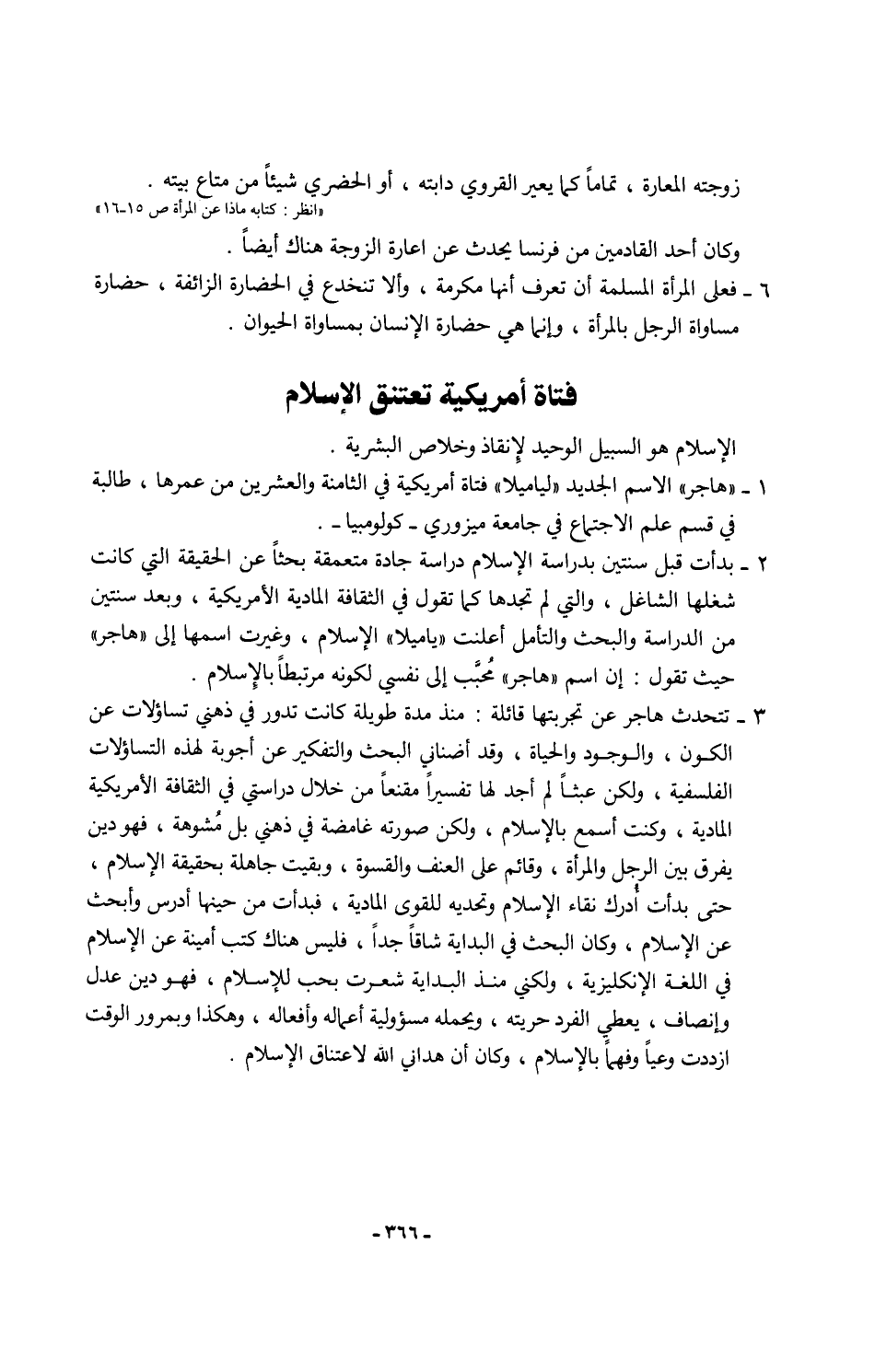 3 - تتحدث هاجر عن تجربتها قائلة: منذ مدة طويلة كانت تدور في ذهني تساؤلات عن الكون، والوجود والحياة، وقد أضناني البحث والتفكير عن أجوبة لهذه التساؤلات الفلسفية، ولكن عبثًا لم أجد لها تفسيرًا مقنعًا من خلال دراستي في الثقافة الأمريكية المادية، وكنت أسمع بالإِسلام، ولكن صورته غامضة في ذهني بل مُشوهة، فهو دين يفرق بين الرجل والمرأة، وقائم على العنف والقسوة، وبقيت جاهلة بحقيقة الإِسلام، حتى بدأت أدرك نقاء الإِسلام وتحديه للقوى المادية، فبدأت من حينها أدرس وأبحث عن الإِسلام، وكان البحث في البداية شاقًا جدًا، فليس هناك كتب أمينة عن الإِسلام في اللغة الإنكليزية، ولكني منذ البداية شعرت بحب للإسلام، فهو دين عدل وإنصاف، يعطي الفرد حريته، ويحمله مسؤولية أعماله وأفعاله، وهكذا وبمرور الوقت ازددت وعيًا وفهمًا بالإِسلام، وكان أن هداني الله لاعتناق الإِسلام.