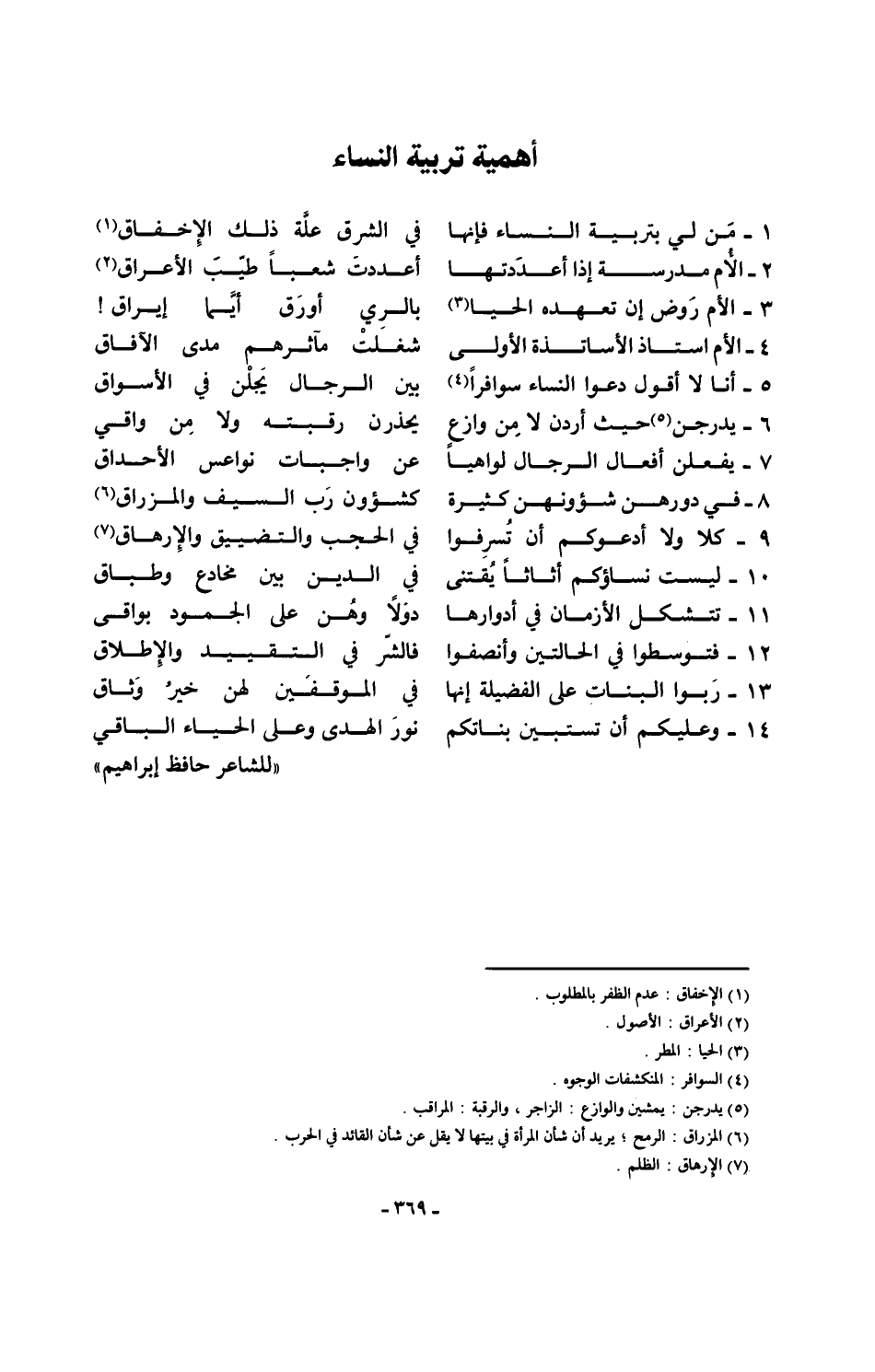 1 - مَن لي بتربية النساء فإنها ... في الشرق علَّة ذلك الإِخفاق (¬1)
