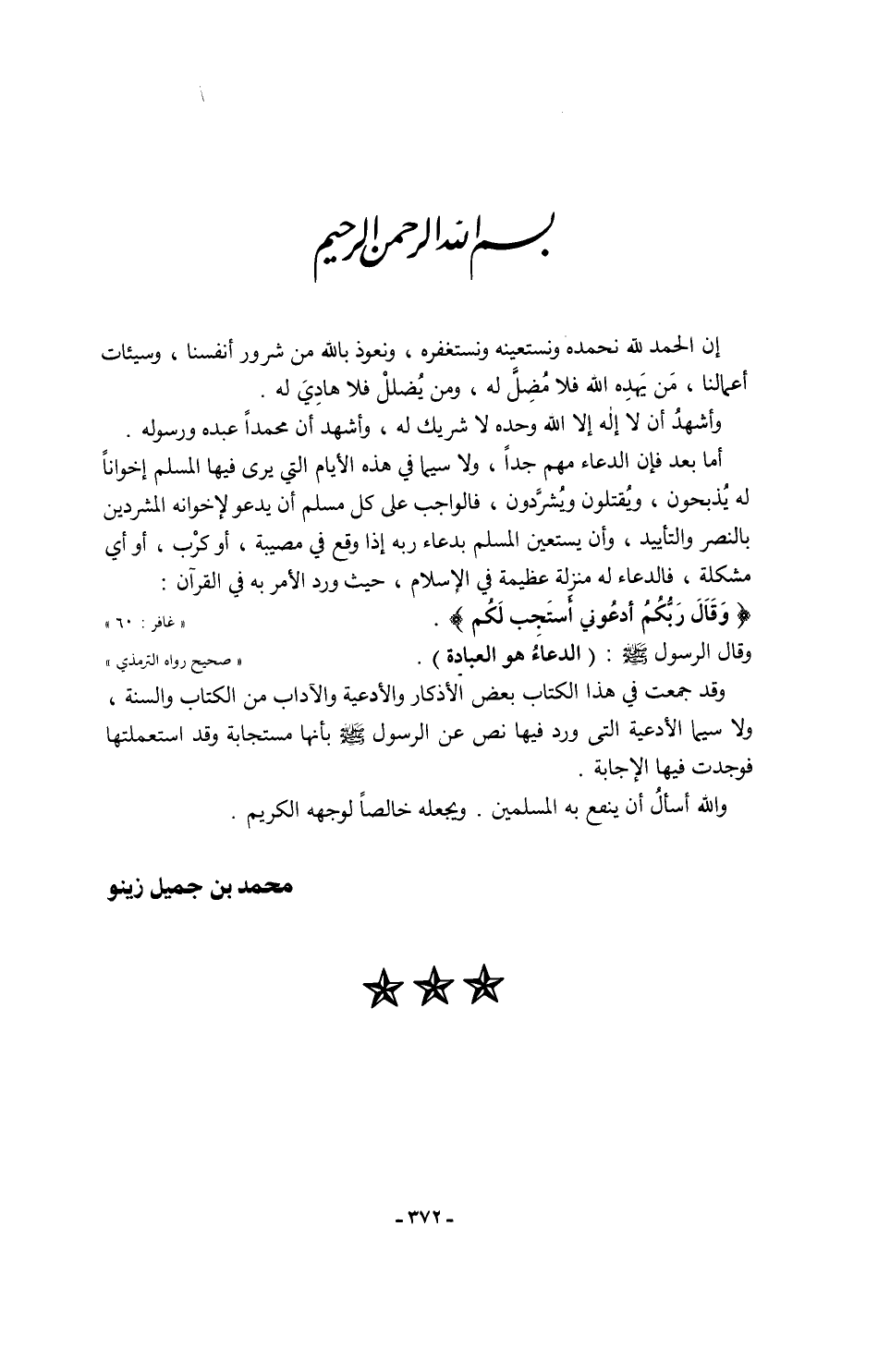 وقد جمعت في هذا الكتاب بعض الأذكار والأدعية والآداب من الكتاب والسنة، ولا سيما الأدعية التي ورد فيها نص عن الرسول - صلى الله عليه وسلم - بأنها مستجابة وقد استعملتها فوجدت فيها الإجابة.
