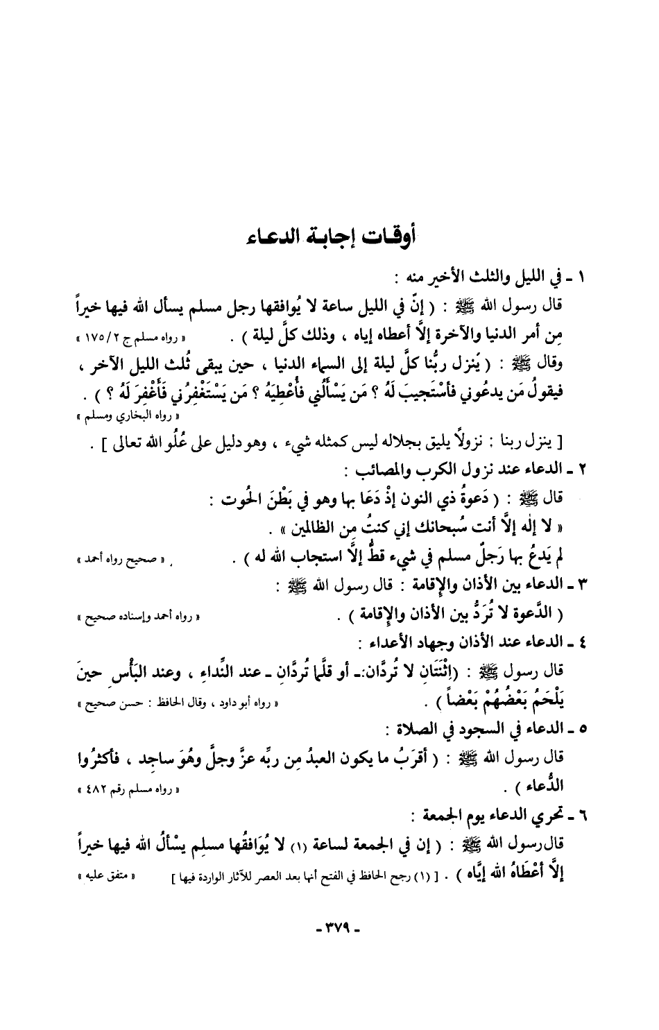 قال رسول - صلى الله عليه وسلم -: (اثْنَتَانِ لا تُردِّان: -أو قلَّما تُردِّانِ- عند النِّداءِ، وعند البَأْسِ حينَ يَلْحَمُ بَعْضُهُمْ بَعْضًا). "رواه أبو داود، وقال الحافظ: حسن صحيح"