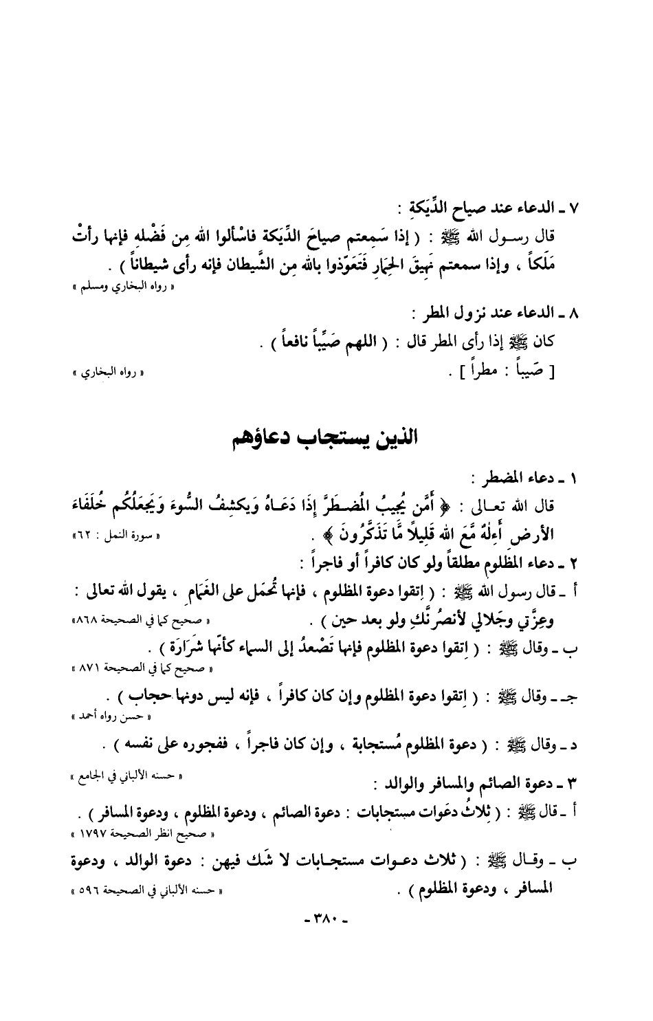 ب - وقال - صلى الله عليه وسلم -: (اتقوا دعوة المظلوم فإنها تَصْعدُ إلى السماء كأنّها شَرَارَة). "صحيح كما في الصحيحة 871"